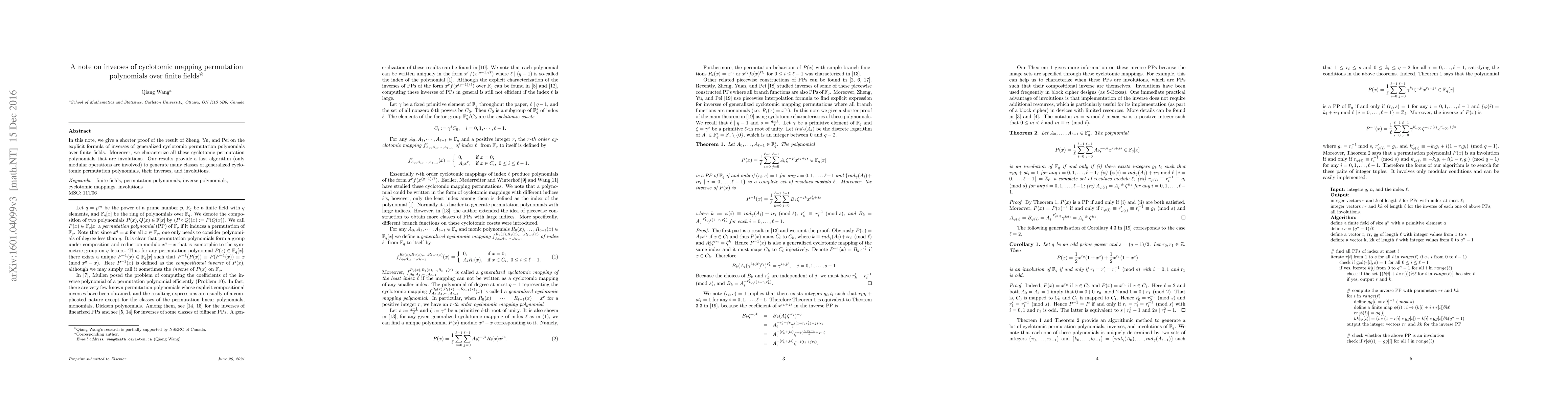 In this note, we give a shorter proof of the result of Zheng, Yu, and Pei on the explicit formula of inverses of generalized cyclotomic permutation polynomials over finite fields. Moreover, we characterize all these cyclotomic permutation polynomials that are involutions. Our results provide a fast algorithm (only modular operations are involved) to generate many classes of generalized cyclotomic permutation polynomials, their inverses, and involutions.