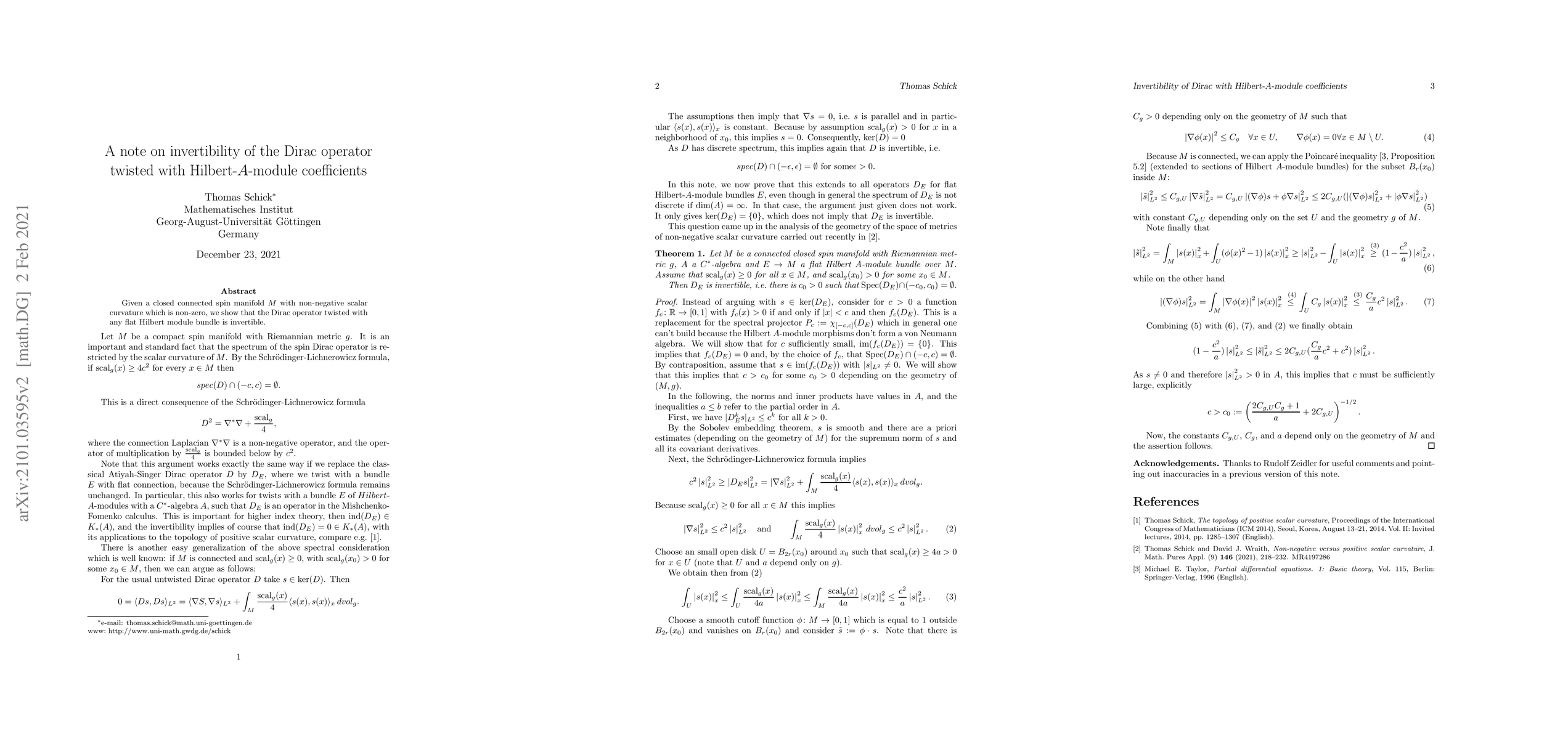 Given a closed connected spin manifold M with non-negative and somewhere positive scalar curvature, we show that the Dirac operator twisted with any flat Hilbert module bundle is invertible.