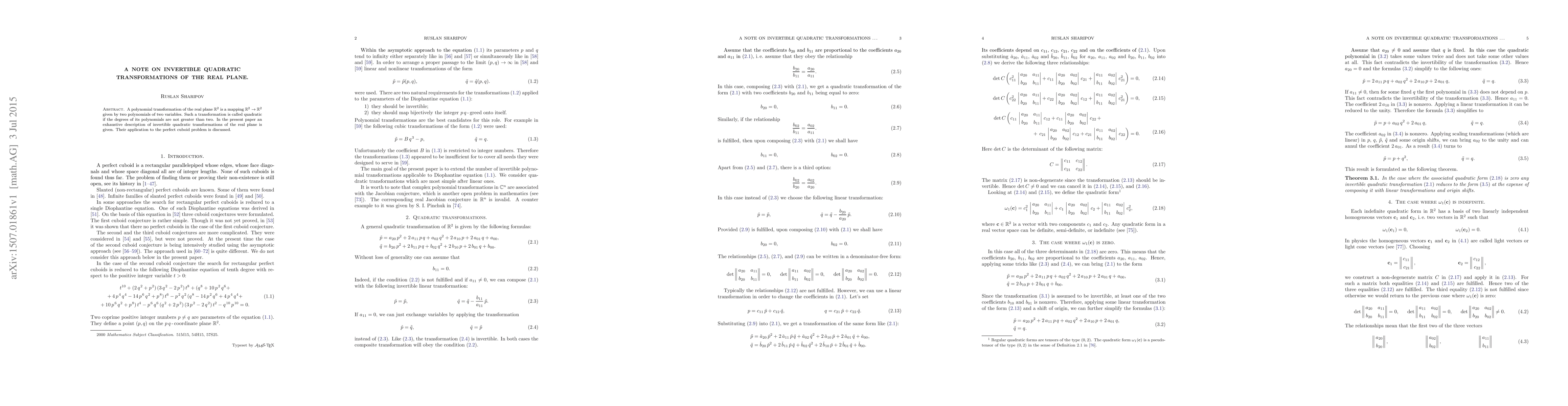 A polynomial transformation of the real plane $\Bbb R^2$ is a mapping $\Bbb R^2\to\Bbb R^2$ given by two polynomials of two variables. Such a transformation is called quadratic if the degrees of its polynomials are not greater than two. In the present paper an exhaustive description of invertible quadratic transformations of the real plane is given. Their application to the perfect cuboid problem is discussed.