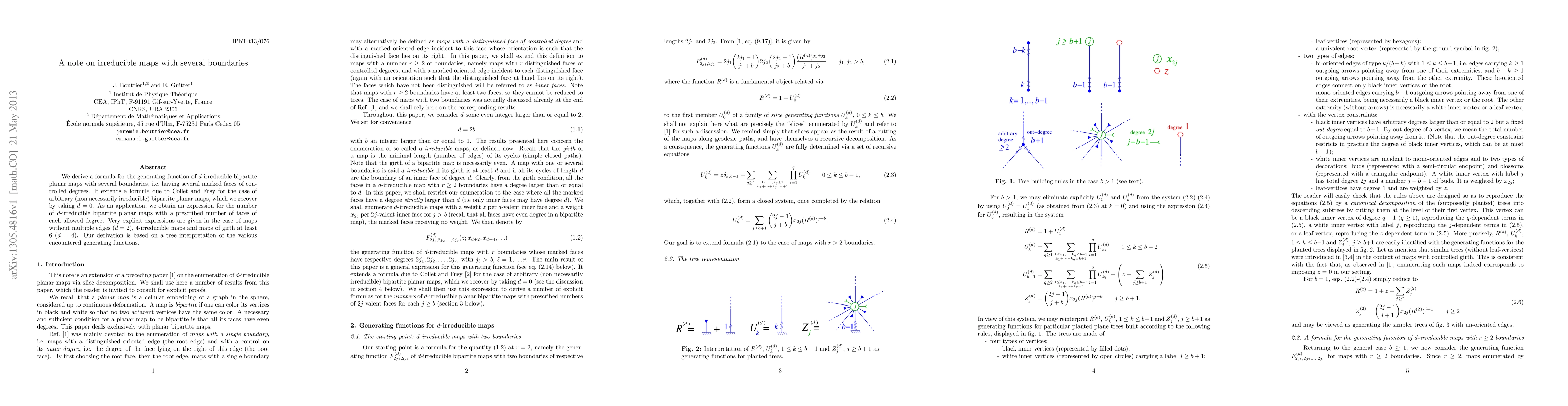 This paper derives a generating function formula for d-irreducible bipartite planar maps with multiple boundaries, extending previous work by Collet and Fusy. It provides explicit expressions for specific cases, including maps without multiple edges and those with girth at least 6.