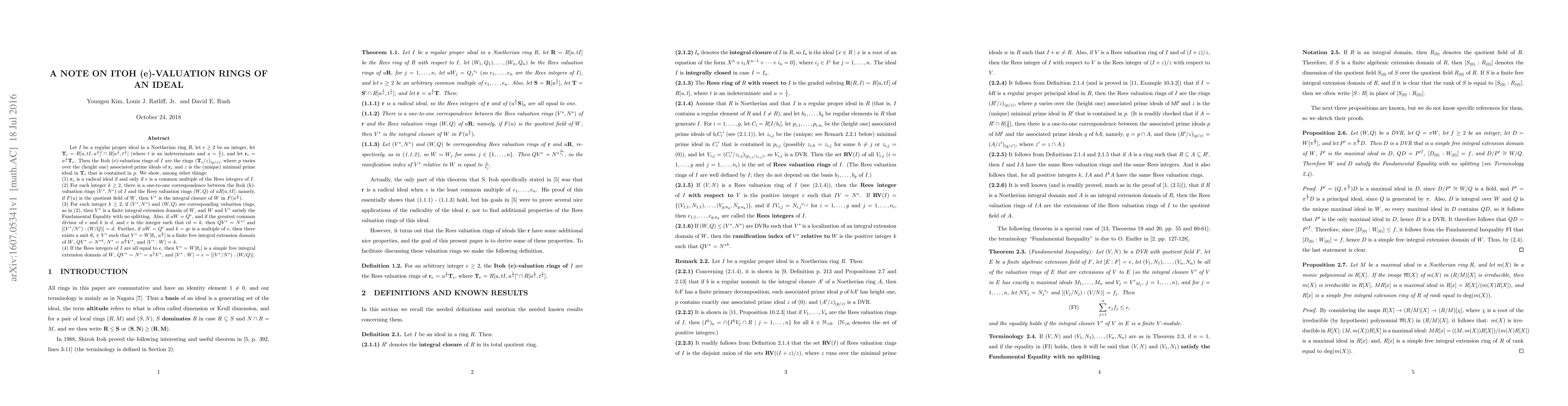 Let $I$ be a regular proper ideal in a Noetherian ring $R$, let $e \ge 2$ be an integer, let $\mathbf T_e = R[u,tI,u^{\frac{1}{e}}]' \cap R[u^{\frac{1}{e}},t^{\frac{1}{e}}]$ (where $t$ is an indeterminate and $u =\frac{1}{t}$), and let $\mathbf r_e = u^{\frac{1}{e}} \mathbf T_e$. Then the Itoh (e)-valuation rings of $I$ are the rings $(\mathbf T_e/z)_{(p/z)}$, where $p$ varies over the (height one) associated prime ideals of $\mathbf r_e$ and $z$ is the (unique) minimal prime ideal in $\mathbf T_e$ that is contained in $p$. We show, among other things: (1) $\mathbf r_e$ is a radical ideal if and only if $e$ is a common multiple of the Rees integers of $I$. (2) For each integer $k \ge 2$, there is a one-to-one correspondence between the Itoh (k)-valuation rings $(V^*,N^*)$ of $I$ and the Rees valuation rings $(W,Q)$ of $uR[u,tI]$; namely, if $F(u)$ is the quotient field of $W$, then $V^*$ is the integral closure of $W$ in $F(u^{\frac{1}{k}})$. (3) For each integer $k \ge 2$, if $(V^*,N^*)$ and $(W,Q)$ are corresponding valuation rings, as in (2), then $V^*$ is a finite integral extension domain of $W$, and $W$ and $V^*$ satisfy the Fundamental Equality with no splitting. Also, if $uW = Q^e$, and if the greatest common divisor of $e$ and $k$ is $d$, and $c$ is the integer such that $cd = k$, then $QV^* = {N^*}^c$ and $[(V^*/N^*):(W/Q)] = d$. Further, if $uW = Q^e$ and $k = qe$ is a multiple of $e$, then there exists a unit $\theta_{e} \in V^*$ such that $V^* = W[\theta_{e},u^{\frac{1}{k}}]$ is a finite free integral extension domain of $W, QV^* = {N^*}^q, N^* = u^{\frac{1}{k}}V^*$, and $[V^*:W] = k$. (4) If the Rees integers of $I$ are all equal to $e$, then $V^* = W[\theta_e]$ is a simple free integral extension domain of $W, QV^* = N^* = u^{\frac{1}{e}}V^*$, and $[V^*:W] = e = [(V^*/N^*):(W/Q)]$.