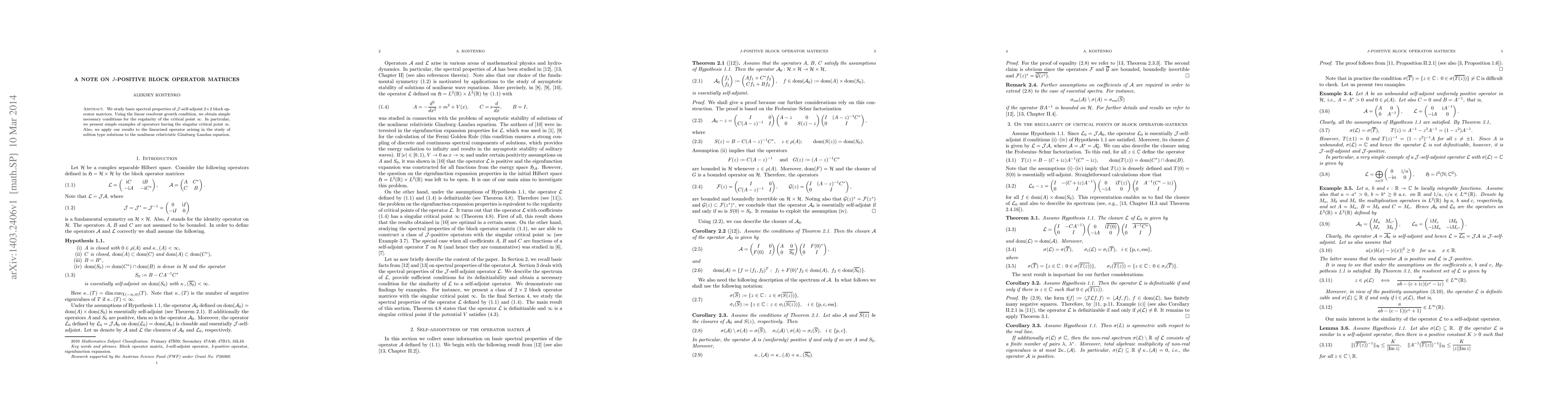 This paper investigates the spectral properties of J-self-adjoint $2\times 2$ block operator matrices, establishing necessary conditions for the regularity of the critical point $\infty$ under the linear resolvent growth condition. It also provides examples of operators with singular critical points at infinity and applies these findings to soliton solutions in the nonlinear relativistic Ginzburg-Landau equation.