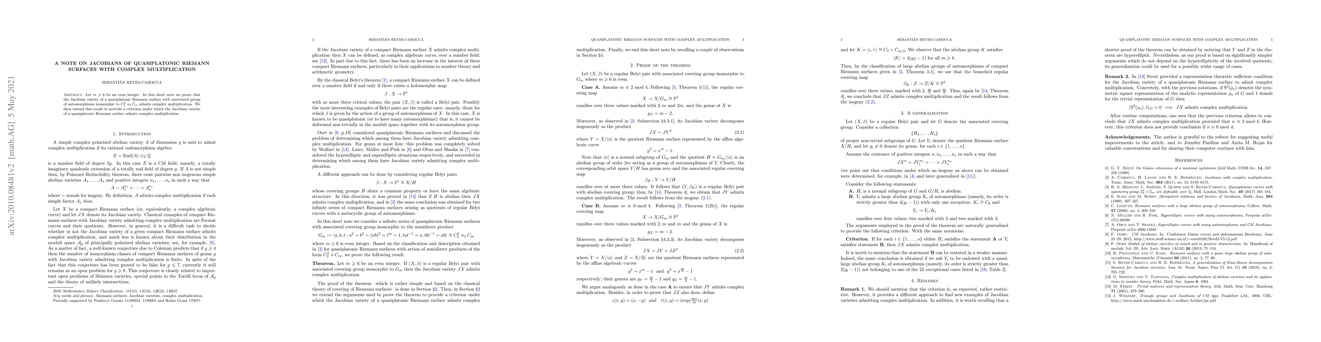 This paper proves that the Jacobian variety of a quasiplatonic Riemann surface with a specific automorphism group structure admits complex multiplication. It further extends this result to establish a general criterion for the Jacobian variety of quasiplatonic Riemann surfaces to exhibit complex multiplication.