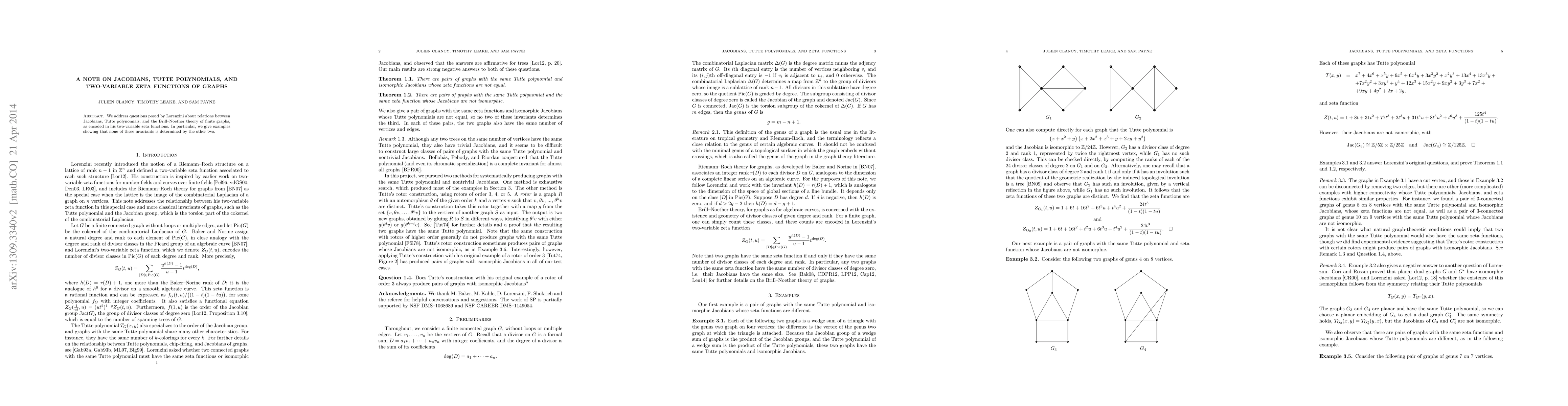 We address questions posed by Lorenzini about relations between Jacobians, Tutte polynomials, and the Brill-Noether theory of finite graphs, as encoded in his two-variable zeta functions. In particular, we give examples showing that none of these invariants is determined by the other two.