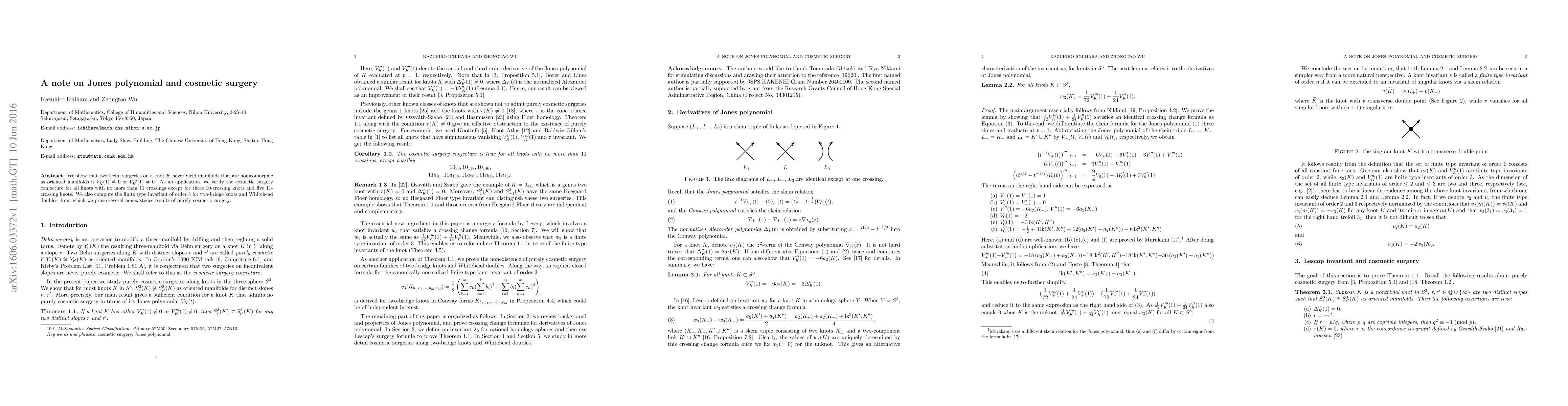 We show that two Dehn surgeries on a knot $K$ never yield manifolds that are homeomorphic as oriented manifolds if $V_K''(1)\neq 0$ or $V_K'''(1)\neq 0$. As an application, we verify the cosmetic surgery conjecture for all knots with no more than $11$ crossings except for three $10$-crossing knots and five $11$-crossing knots. We also compute the finite type invariant of order $3$ for two-bridge knots and Whitehead doubles, from which we prove several nonexistence results of purely cosmetic surgery.
