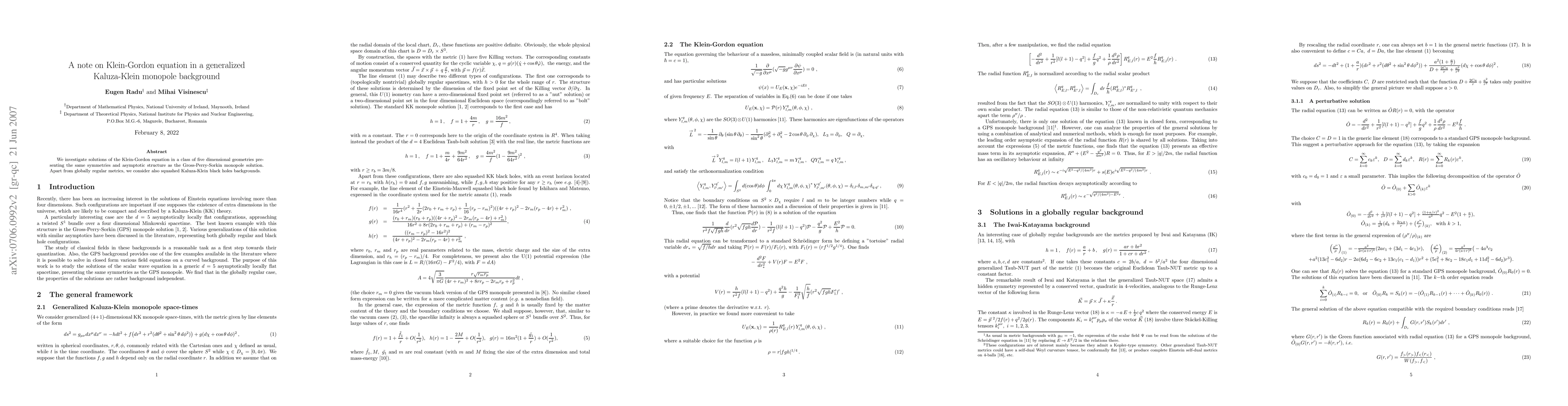 Summary: This study explores Klein-Gordon equation solutions in five-dimensional geometries with symmetries akin to the Gross-Perry-Sorkin monopole, including globally regular metrics and squashed Kaluza-Klein black hole backgrounds.