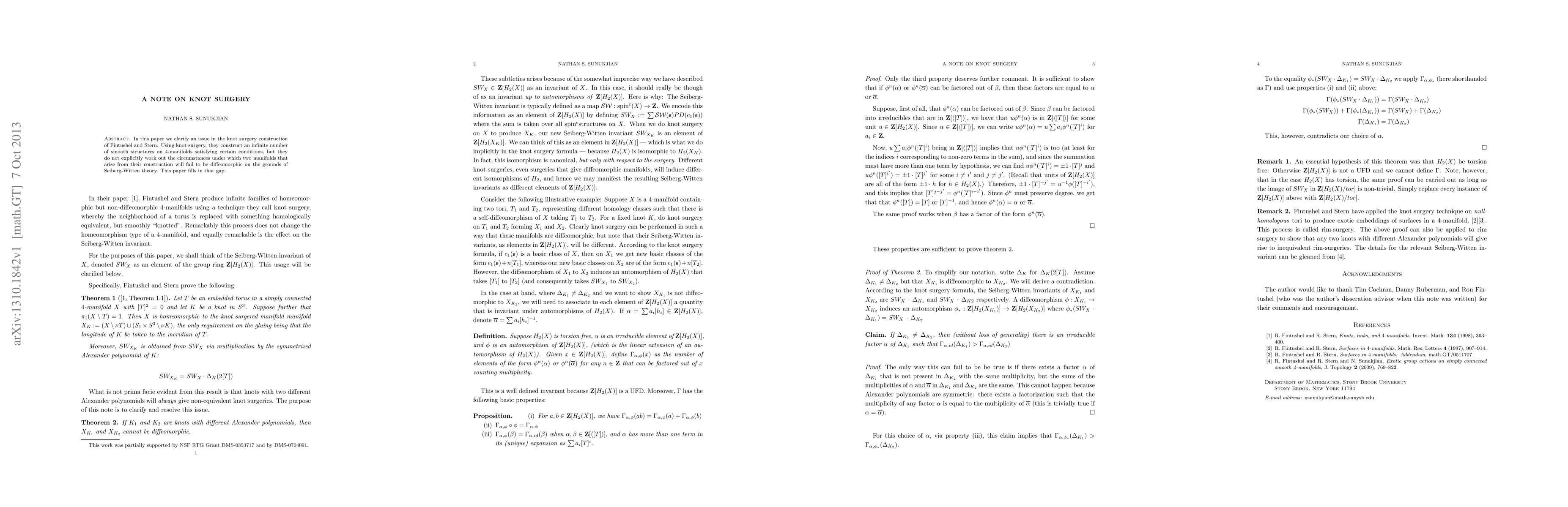 This paper resolves an ambiguity in Fintushel and Stern's knot surgery method for constructing smooth 4-manifolds, specifying the conditions under which resulting manifolds are not diffeomorphic, as indicated by Seiberg-Witten theory.