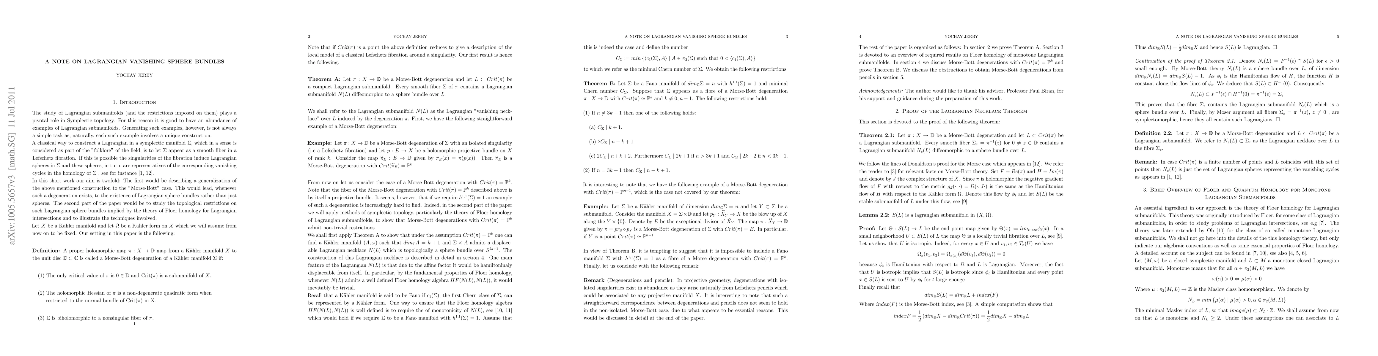 A classical way to construct a Lagrangian in a symplectic manifold $\Sigma$ is to let $\Sigma$ appear as a smooth fiber in a Lefschetz fibration. If this is possible the singularities of the fibration induce Lagrangian spheres in $\Sigma$ and these spheres, in turn, are representatives of the corresponding vanishing cycles in the homology of $\Sigma$. In this paper our aim is twofold: The first is to describe a generalization of the above mentioned construction to the "Morse-Bott" case. This leads, whenever such a degeneration exists, to the existence of Lagrangian sphere bundles rather than just spheres. In the second part of the paper we study the type of topological restrictions on such Lagrangian sphere bundles arising from the theory of Floer homology for Lagrangian intersections and to illustrate the techniques involved.