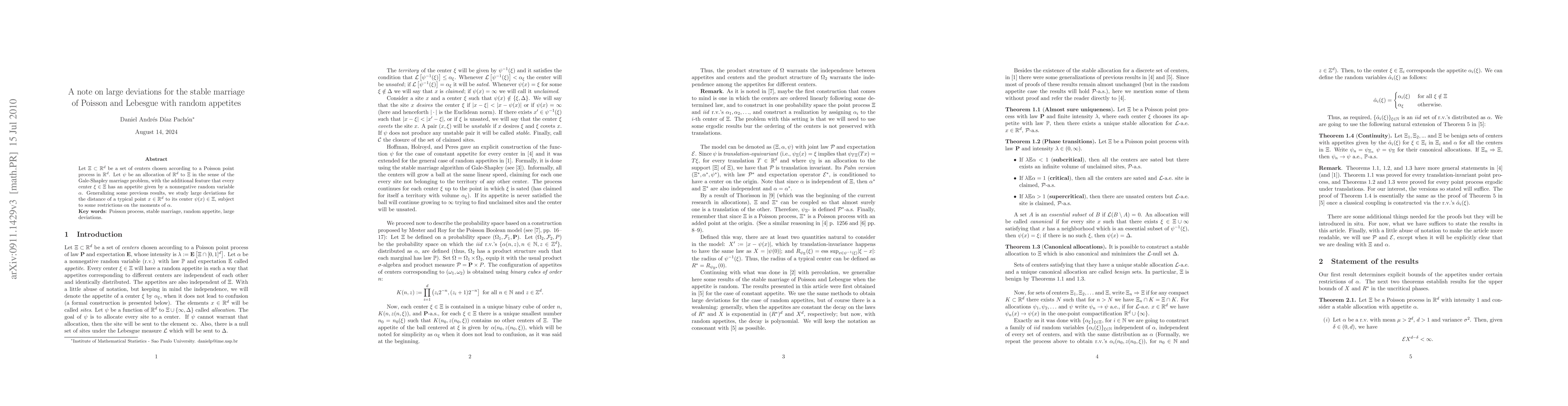 Let $\Xi\subset\mathbb R^d$ be a set of centers chosen according to a Poisson point process in $\mathbb R^d$. Let $\psi$ be an allocation of $\mathbb R^d$ to $\Xi$ in the sense of the Gale-Shapley marriage problem, with the additional feature that every center $\xi\in\Xi$ has an appetite given by a nonnegative random variable $\alpha$. Generalizing some previous results, we study large deviations for the distance of a typical point $x\in\mathbb R^d$ to its center $\psi(x)\in\Xi$, subject to some restrictions on the moments of $\alpha$.