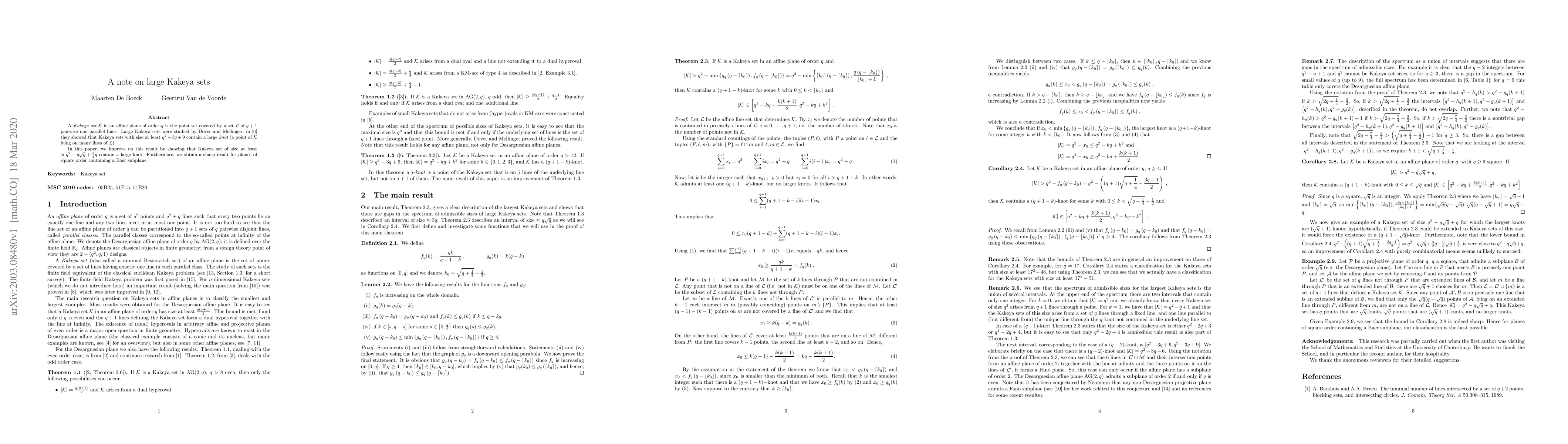 A Kakeya set $\mathcal{K}$ in an affine plane of order $q$ is the point set covered by a set $\mathcal{L}$ of $q+1$ pairwise non-parallel lines. Large Kakeya sets were studied by Dover and Mellinger; in [6] they showed that Kakeya sets with size at least $q^2-3q+9$ contain a large knot (a point of $\mathcal{K}$ lying on many lines of $\mathcal{L}$). In this paper, we improve on this result by showing that Kakeya set of size at least $\approx q^2-q\sqrt{q}+\frac{3}{2}q$ contain a large knot. Furthermore, we obtain a sharp result for planes of square order containing a Baer subplane.