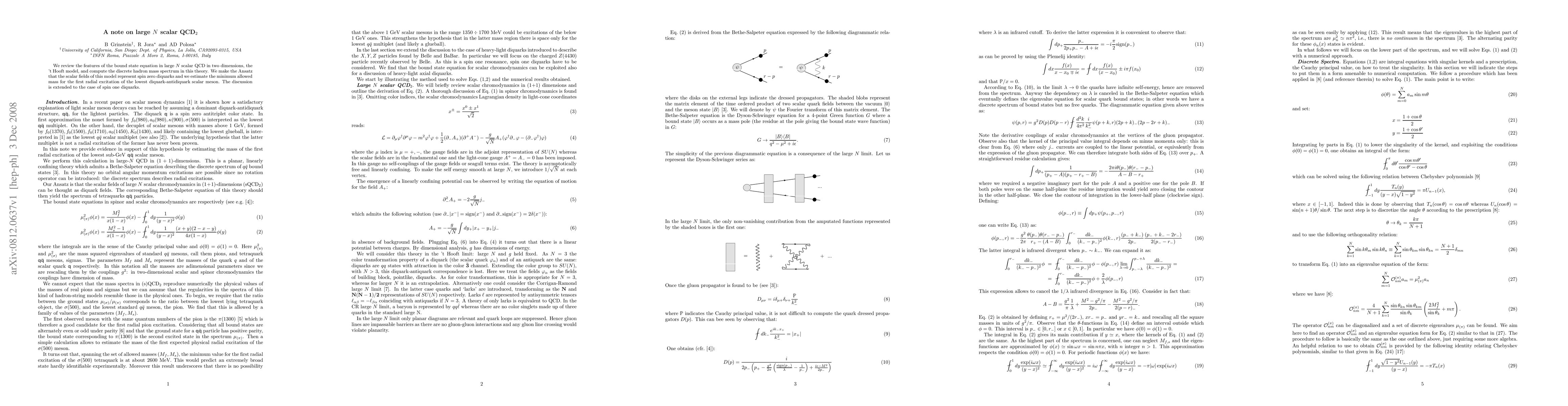 We review the features of the bound state equation in large N scalar QCD in two dimensions, the 't Hooft model, and compute the discrete hadron mass spectrum in this theory. We make the Ansatz that the scalar fields of this model represent spin zero diquarks and we estimate the minimum allowed mass for the first radial excitation of the lowest diquark-antidiquark scalar meson. The discussion is extended to the case of spin one diquarks.