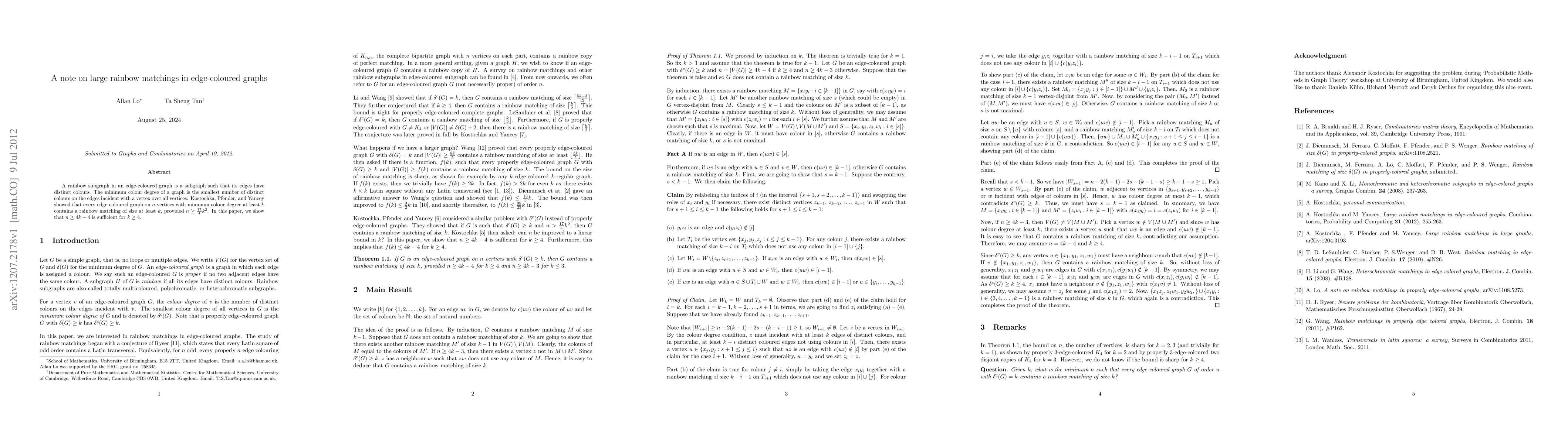 This paper demonstrates that an edge-coloured graph with minimum colour degree at least $k$ and at least $4k-4$ vertices contains a rainbow matching of size at least $k$, improving upon the previous result which required $n\geq (17/4)k^2$ vertices for $k \ge 4$.
