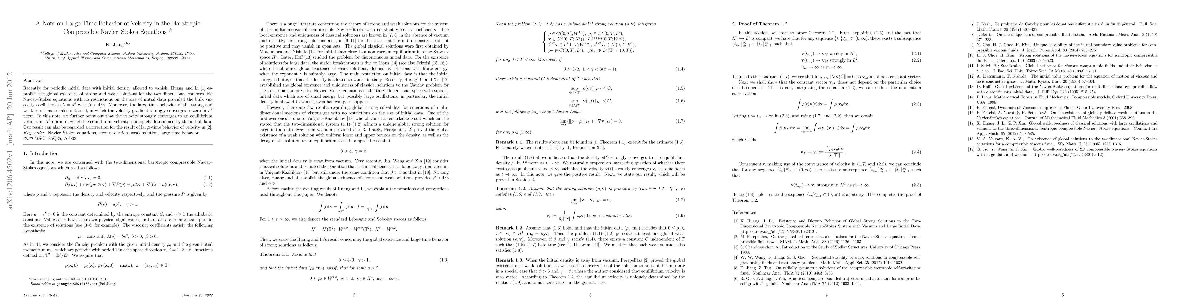 Recently, for periodic initial data with initial density allowed to vanish, Huang and Li [1] establish the global existence of strong and weak solutions for the two-dimensional compressible Navier{Stokes equations with no restrictions on the size of initial data provided the bulk viscosity coefficient is \lambda = \rho^\beta with \beta > 4/3. Moreover, the large-time behavior of the strong and weak solutions are also obtained, in which the velocity gradient strongly converges to zero in L^2 norm. In this note, we further point out that the velocity strongly converges to an equilibrium velocity in H^1 norm, in which the equilibrium velocity is uniquely determined by the initial data. Our result can also be regarded a correction for the result of large-time behavior of velocity in [2].