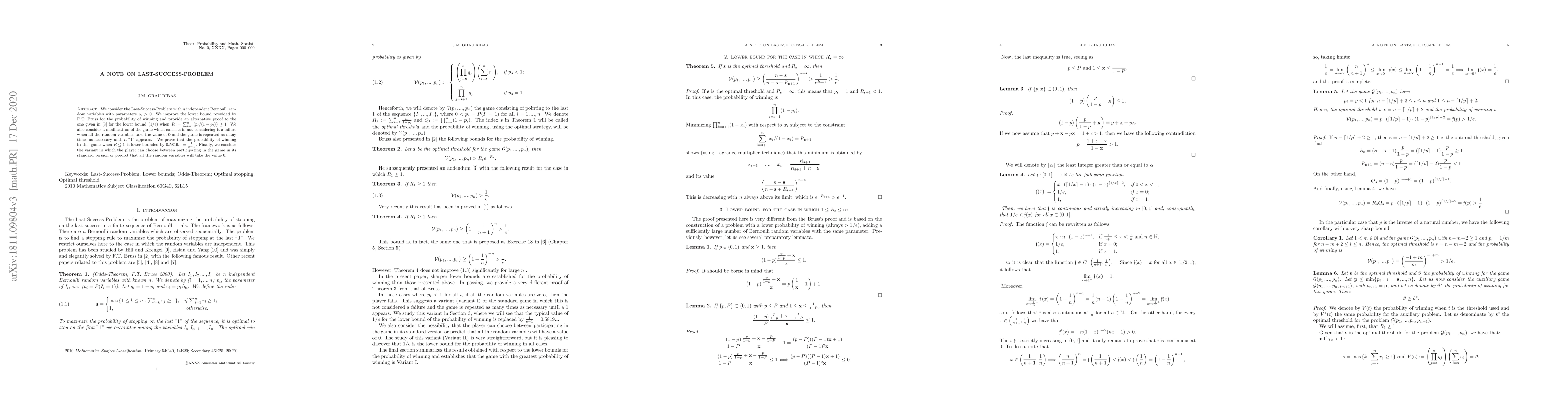 We consider the Last-Success-Problem with $n$ independent Bernoulli random variables with parameters $p_i>0$. We improve the lower bound provided by F.T. Bruss for the probability of winning and provide an alternative proof to the one given for the lower bound ($1/e$) when $R:=\sum_{i=1}^n (p_i/(1-p_i))\geq1$. We also consider a modification of the game which consists in not considering it a failure when all the random variables take the value of 0 and the game is repeated as many times as necessary until a $"1"$ appears. We prove that the probability of winning in this game is lower-bounded by $e^{-1}(1-e^{-R})^{-1}$. Finally, we consider the variant in which the player can choose between participating in the game in its standard version or predict that all the random variables will take the value 0.