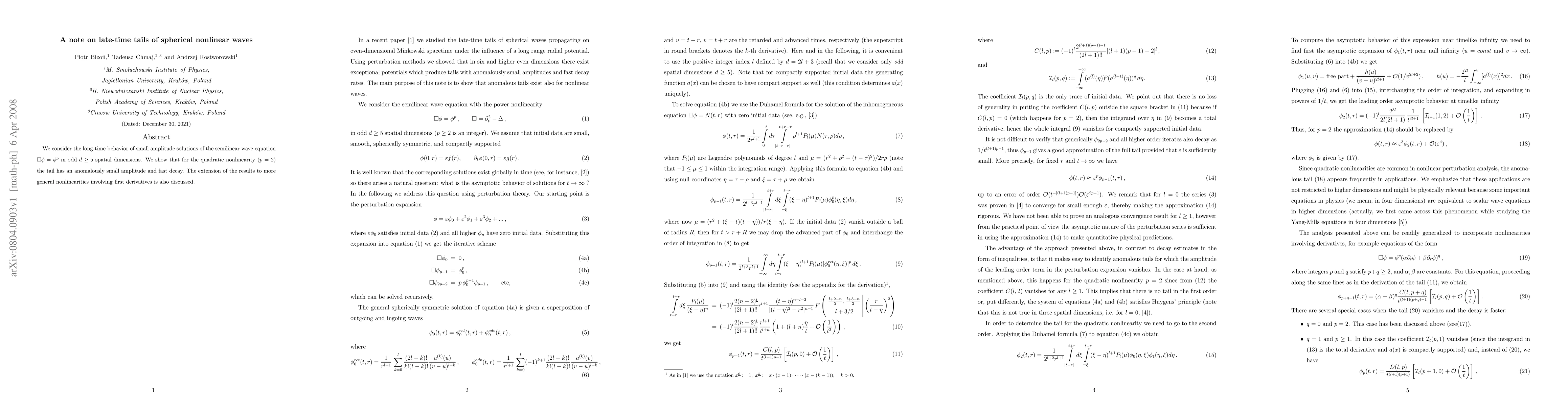 Research on spherical nonlinear waves in odd dimensions $d imes 5$ shows that quadratic nonlinearity leads to an unusually small amplitude tail with fast decay, with implications for understanding long-term behavior of such waves.