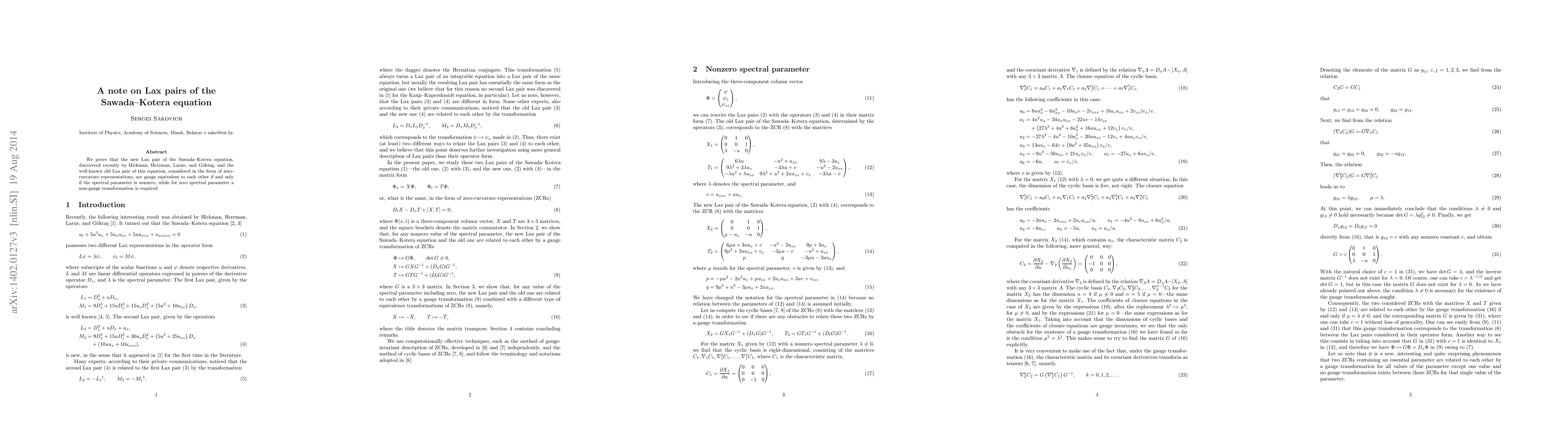 This paper demonstrates that the recently discovered Lax pair for the Sawada-Kotera equation is gauge equivalent to the traditional one when the spectral parameter is nonzero, but requires a non-gauge transformation when the spectral parameter is zero.