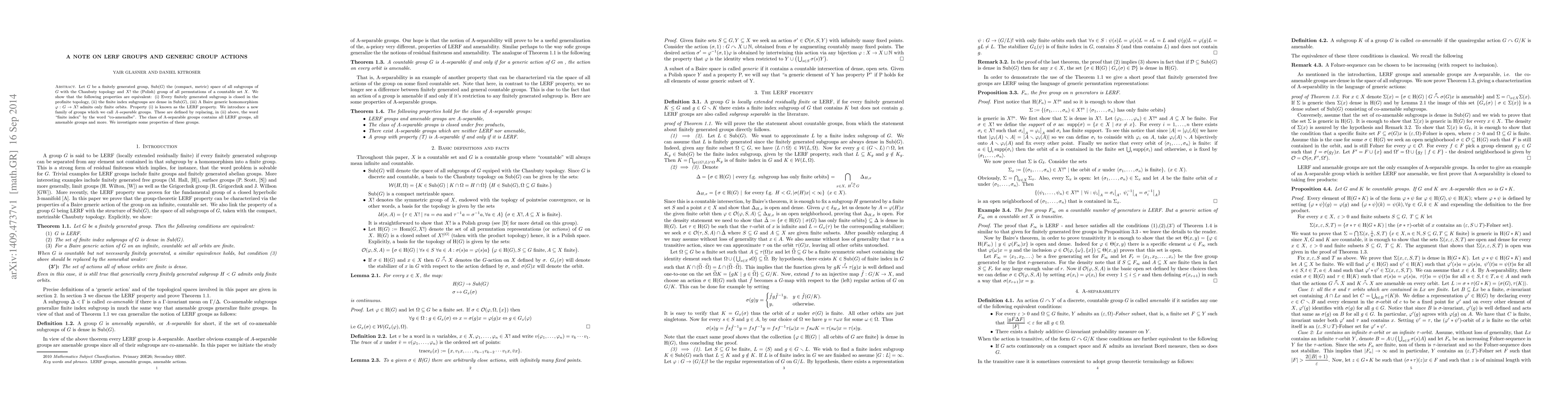 Let $G$ be a finitely generated group, $\mathrm{Sub}(G)$ the (compact, metric) space of all subgroups of $G$ with the Chaubuty topology and $X!$ the (Polish) group of all permutations of a countable set $X$. We show that the following properties are equivalent: (i) Every finitely generated subgroup is closed in the profinite topology, (ii) the finite index subgroups are dense in $\mathrm{Sub}(G)$, (iii) A Baire generic homomorphism $\phi: G \rightarrow X!$ admits only finite orbits. Property (i) is known as the LERF property. We introduce a new family of groups which we call {\it{A-separable}} groups. These are defined by replacing, in (ii) above, the word "finite index" by the word "co-amenalbe". The class of A-separable groups contains all LERF groups, all amenable groups and more. We investigate some properties of these groups.