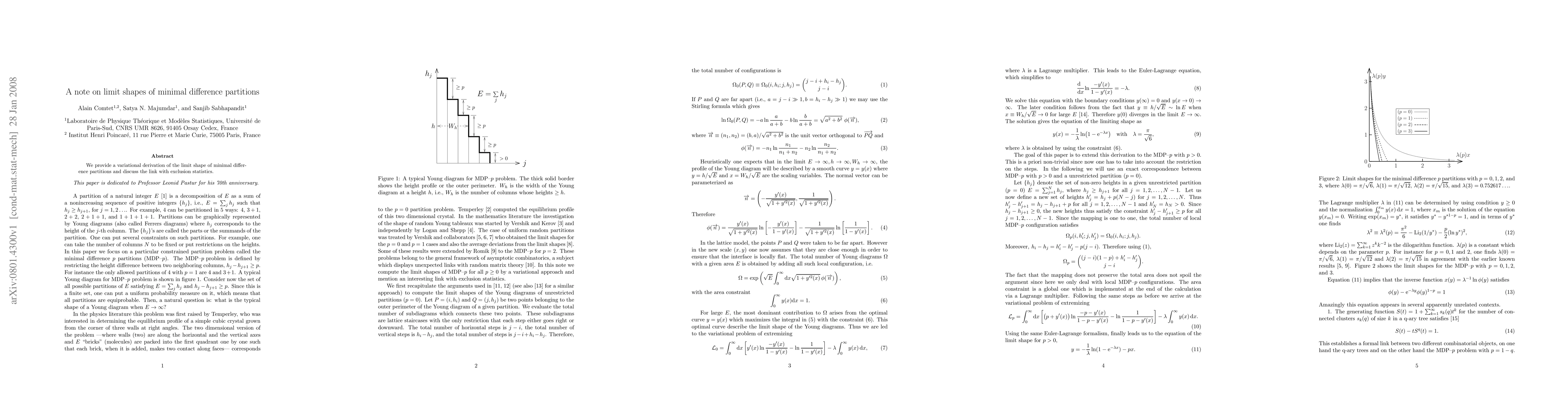 We provide a variational derivation of the limit shape of minimal difference partitions and discuss the link with exclusion statistics. Also see arXiv:0707.2312 for a related paper.