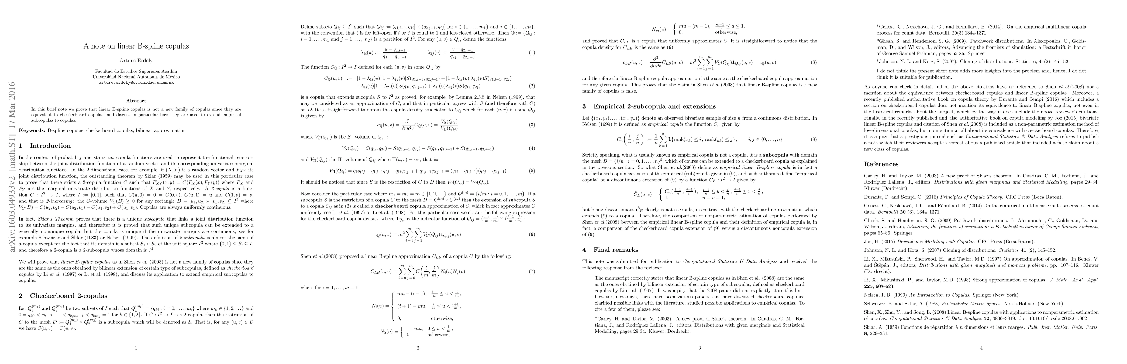 In this brief note we prove that linear B-spline copulas is not a new family of copulas since they are equivalent to checkerboard copulas, and discuss in particular how they are used to extend empirical subcopulas to copulas.