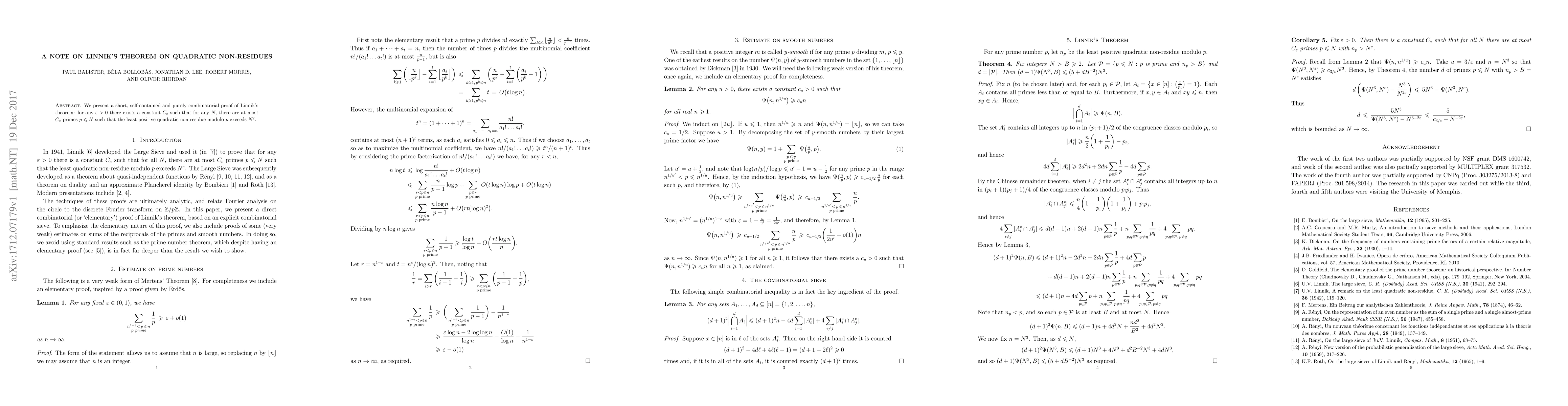 Researchers prove Linnik's theorem using a combinatorial approach, showing that for any positive value of epsilon, there is a constant C_epsilon such that no more than C_epsilon primes exist below N where the smallest quadratic non-residue exceeds N^epsilon.