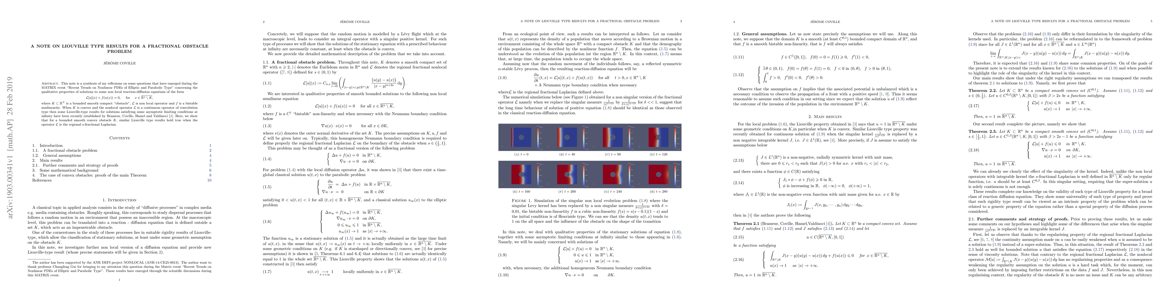 This note is a synthesis of my reflexions on some questions that have emerged during the MATRIX event "Recent Trends on Nonlinear PDEs of Elliptic and Parabolic Type" concerning the qualitative properties of solutions to some non local reaction-diffusion equations of the form L[u](x) + f (u(x)) = 0, for x $\in$ R n \ K, where K $\subset$ R N is a bounded smooth compact "obstacle", L is non local operator and f is a bistable nonlinearity. When K is convex and the nonlocal operator L is a continuous operator of convolution type then some Liouville-type results for solutions satisfying some asymptotic limiting conditions at infinity have been recently established by Brasseur, Coville, Hamel and Valdinoci [4]. Here, we show that for a bounded smooth convex obstacle K, similar Liouville type results hold true when the operator L is the regional s-fractional Laplacian.