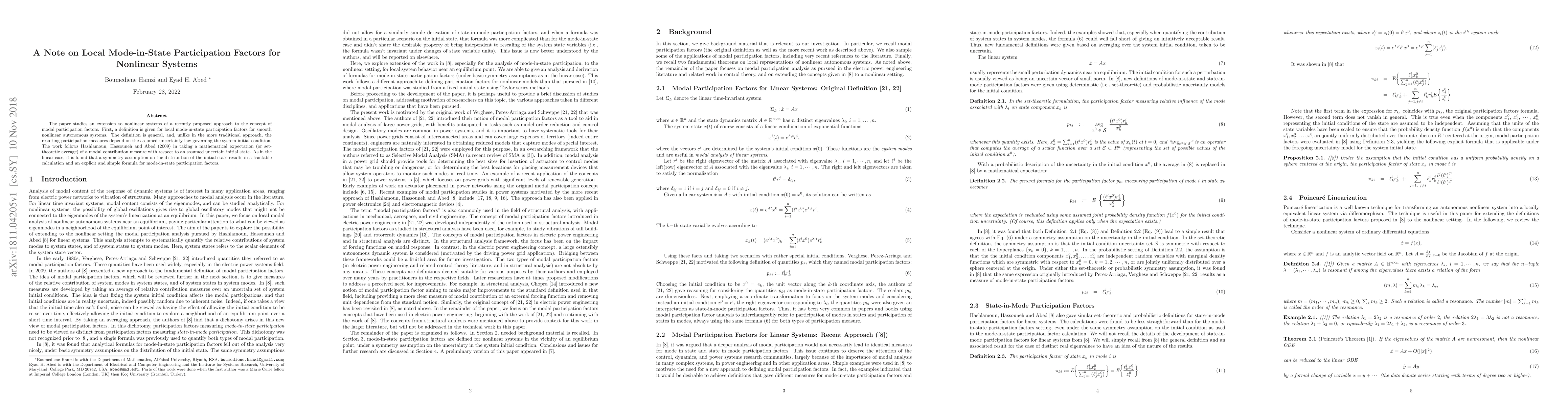 The paper studies an extension to nonlinear systems of a recently proposed approach to the concept of modal participation factors. First, a definition is given for local mode-in-state participation factors for smooth nonlinear autonomous systems. The definition is general, and, unlike in the more traditional approach, the resulting participation measures depend on the assumed uncertainty law governing the system initial condition. The work follows Hashlamoun, Hassouneh and Abed (2009) in taking a mathematical expectation (or set-theoretic average) of a modal contribution measure with respect to an assumed uncertain initial state. As in the linear case, it is found that a symmetry assumption on the distribution of the initial state results in a tractable calculation and an explicit and simple formula for mode-in-state participation factors.