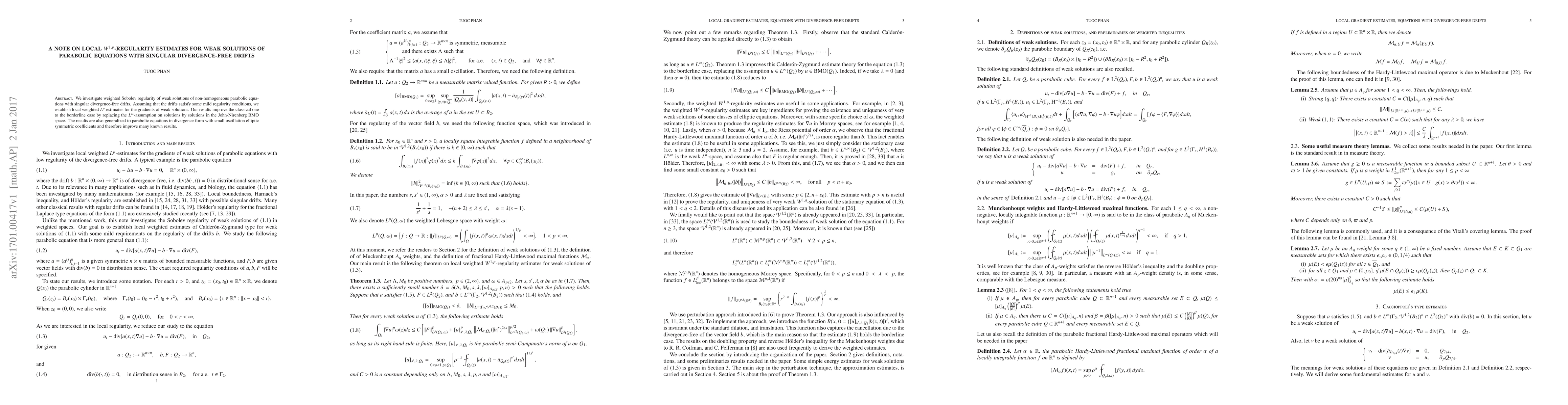 This paper establishes local weighted $W^{1,p}$-regularity estimates for weak solutions of non-homogeneous parabolic equations with singular divergence-free drifts, improving classical results by replacing $L^\infty$-assumptions with solutions in the BMO space. The findings are extended to parabolic equations with small oscillation elliptic symmetric coefficients.