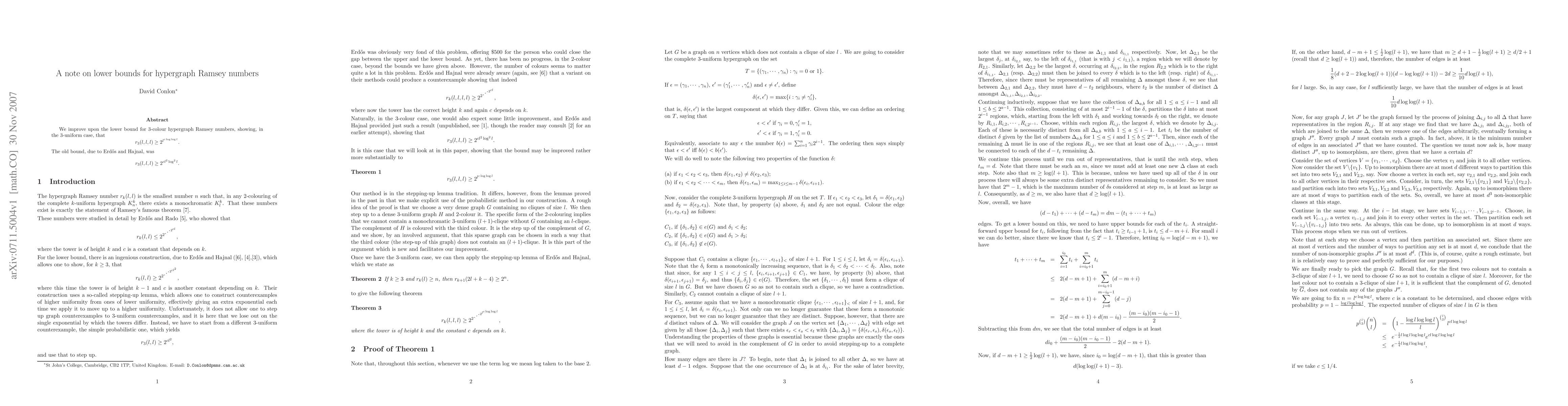 This paper enhances the lower bound for 3-colour hypergraph Ramsey numbers, specifically for 3-uniform hypergraphs, proving that \( r_3 (l,l,l) \geq 2^{l^{c \log \log l}} \), surpassing the previous bound of \( 2^{c l^2 \log^2 l} \) established by Erdős and Hajnal.