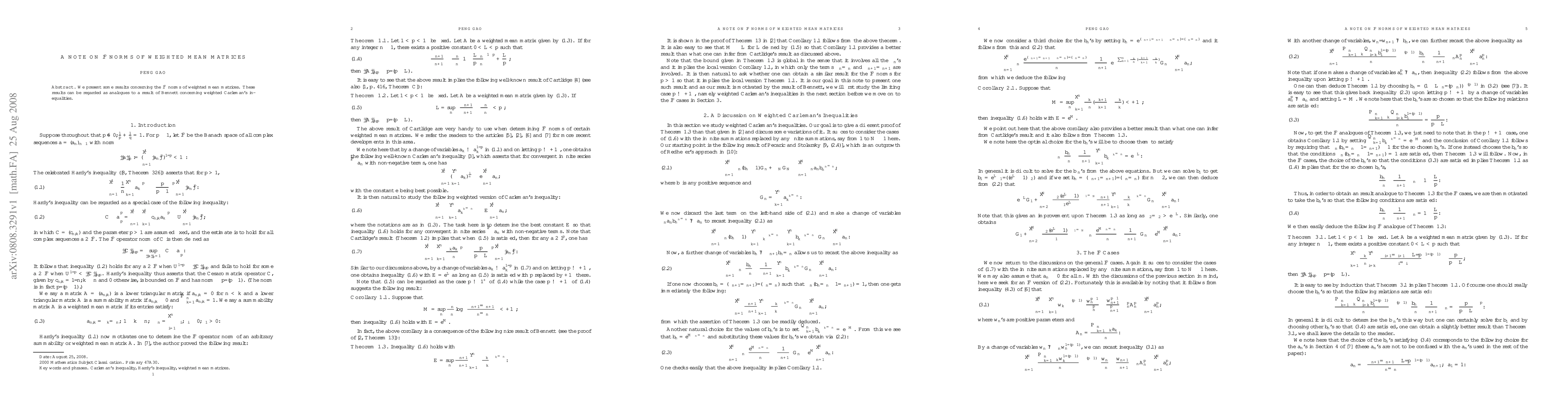 Summary: This paper investigates the $l^p$ norms of weighted mean matrices, presenting results analogous to Bennett's findings on weighted Carleman's inequalities. The study provides new insights into the behavior of these norms under specific weighting schemes.