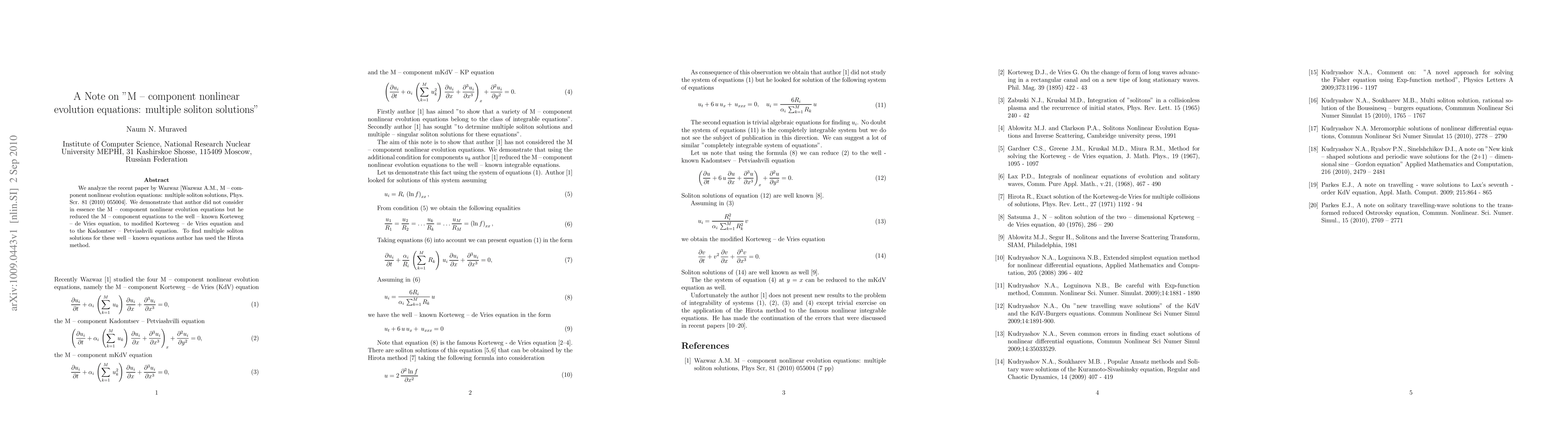 This paper critiques Wazwaz's 2010 study, revealing that the author's claimed M-component nonlinear evolution equations were actually reduced to familiar equations like Korteweg-de Vries and Kadomtsev-Petviashvili. The multiple soliton solutions were found using the Hirota method, not directly from the M-component equations as initially presented.