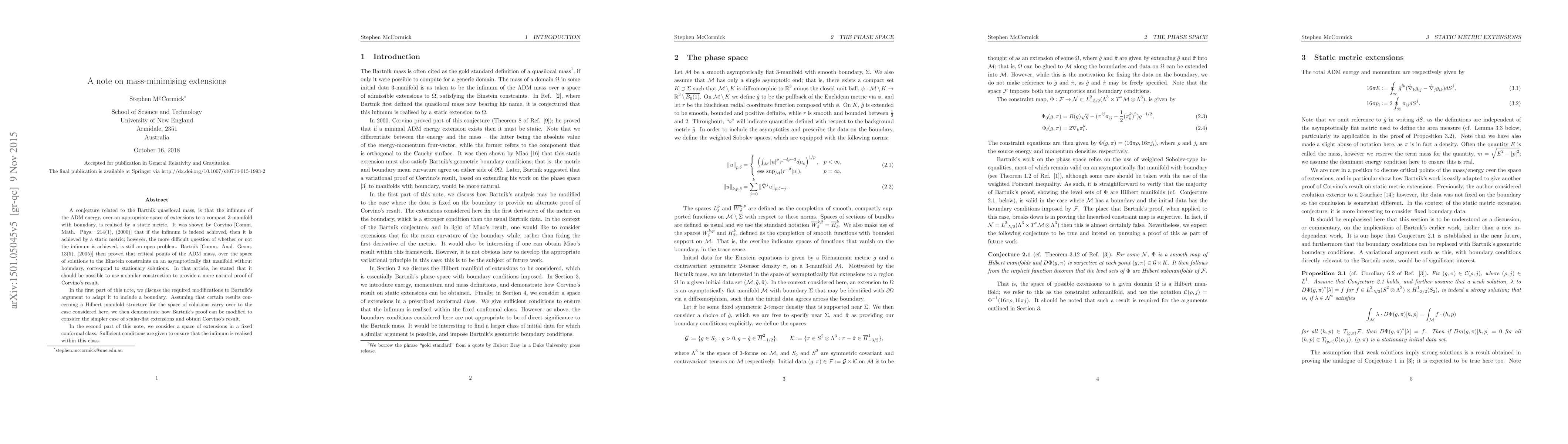 This paper discusses modifications to Bartnik's proof to establish mass-minimizing extensions with a boundary, confirming Corvino's result for static metrics. It also explores conditions ensuring the infimum of ADM energy is realized within a fixed conformal class of extensions.