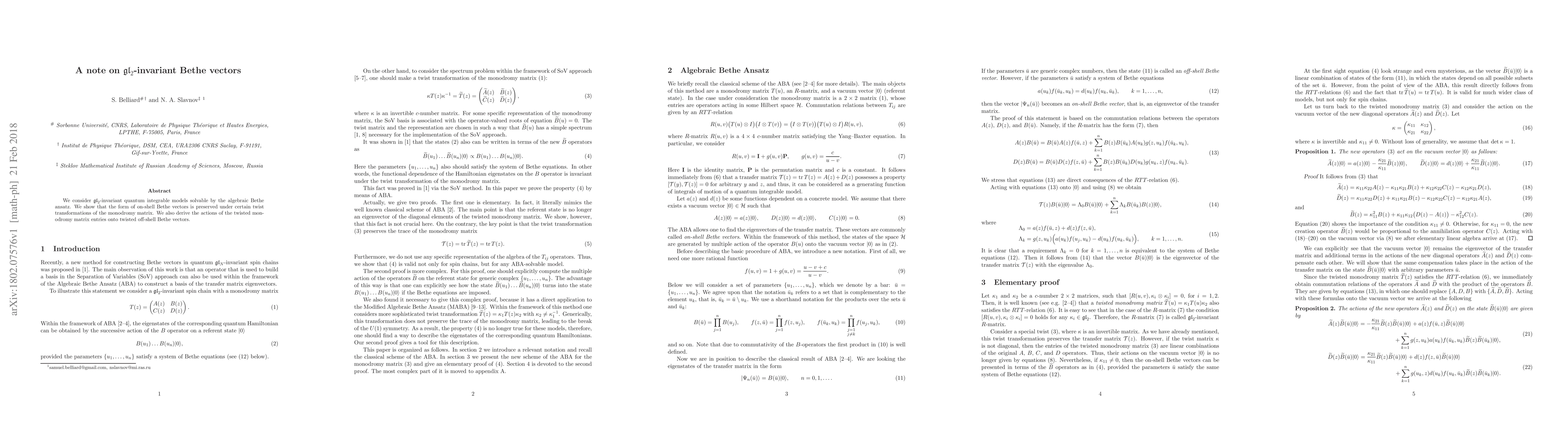This paper investigates $\mathfrak{gl}_2$-invariant quantum integrable models solvable via the algebraic Bethe ansatz, demonstrating that on-shell Bethe vectors maintain their form under specific twist transformations of the monodromy matrix, and deriving the effects of these transformations on twisted off-shell Bethe vectors.