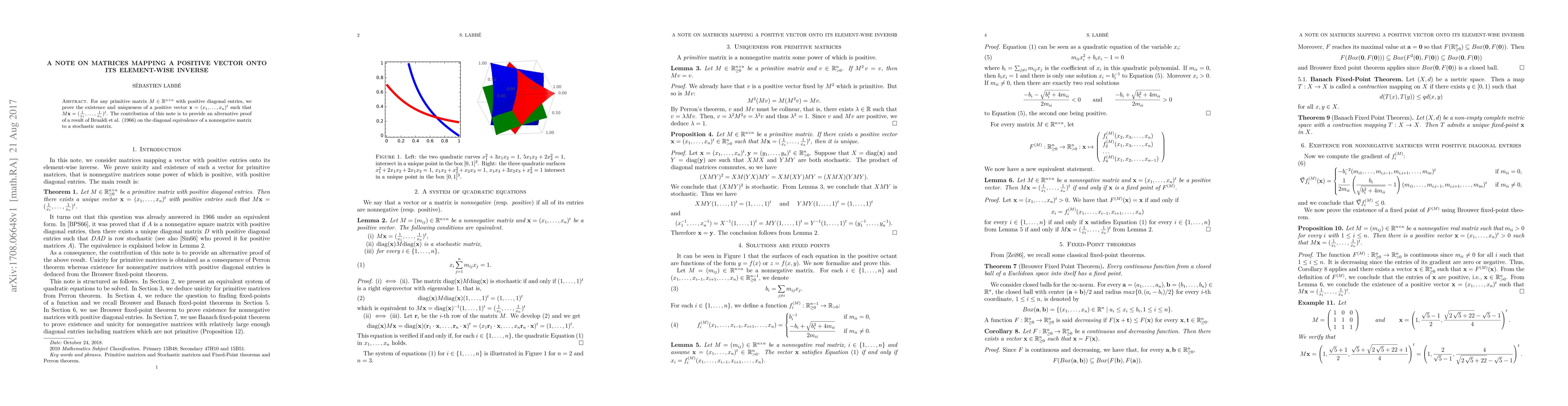 For any primitive matrix $M\in\mathbb{R}^{n\times n}$ with positive diagonal entries, we prove the existence and uniqueness of a positive vector $\mathbf{x}=(x_1,\dots,x_n)^t$ such that $M\mathbf{x}=(\frac{1}{x_1},\dots,\frac{1}{x_n})^t$. The contribution of this note is to provide an alternative proof of a result of Brualdi et al. (1966) on the diagonal equivalence of a nonnegative matrix to a stochastic matrix.