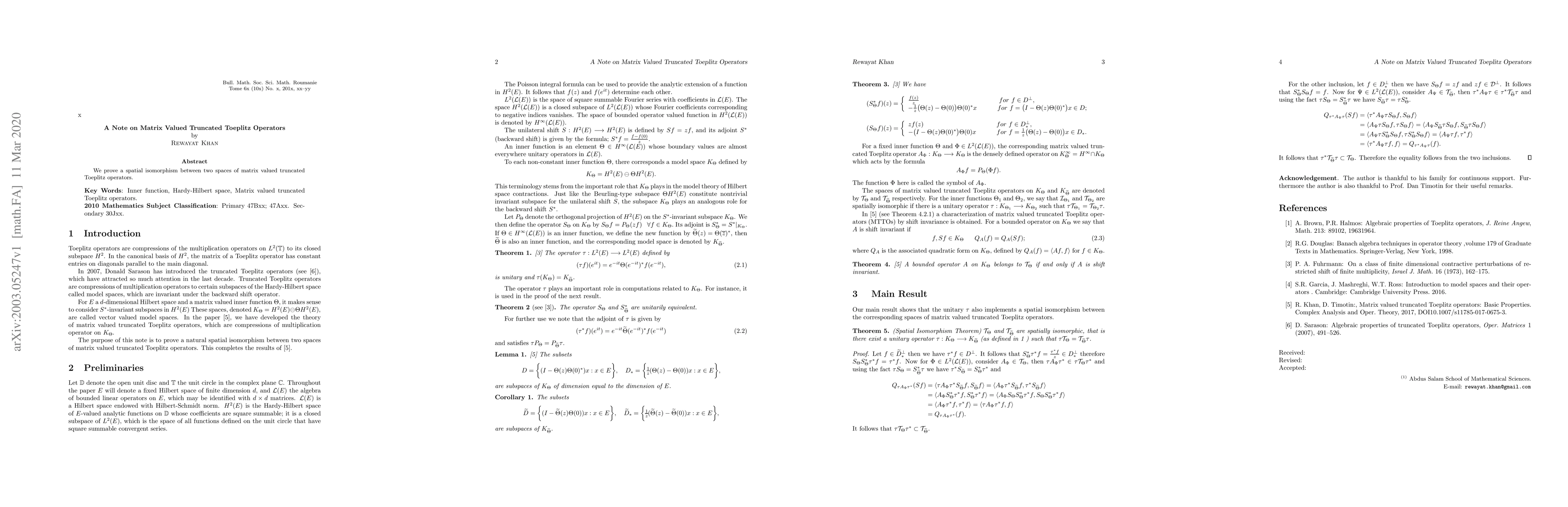 Summary: This paper establishes a spatial isomorphism between two spaces of matrix valued truncated Toeplitz operators, providing deeper insight into their structural relationships. The proof highlights the intrinsic equivalence of these operator spaces.