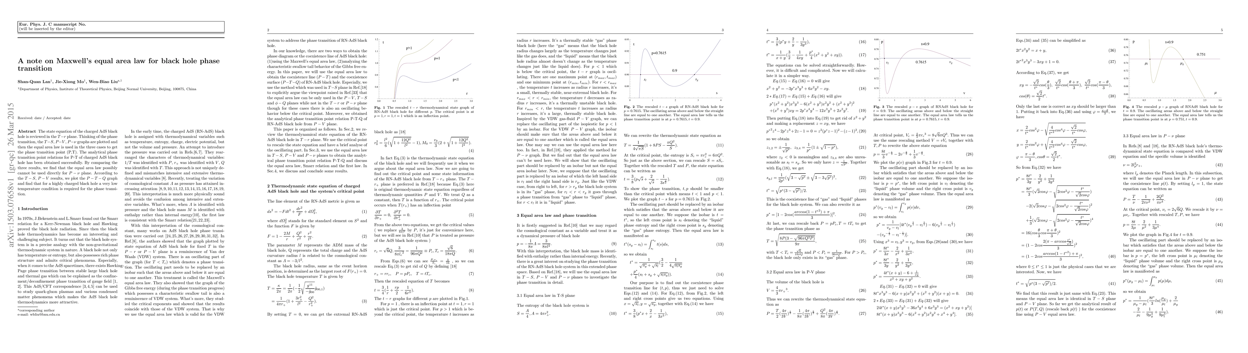 This paper reviews the state equation of charged AdS black holes and applies Maxwell's equal area law to $T-S$, $P-V$, and $P-\nu$ graphs to determine the phase transition point. The analysis suggests that while the equal area law works for $T-S$ and $P-V$ graphs, it may not directly apply to the $P-\nu$ plane, and a highly charged black hole requires a very low temperature for phase transition.