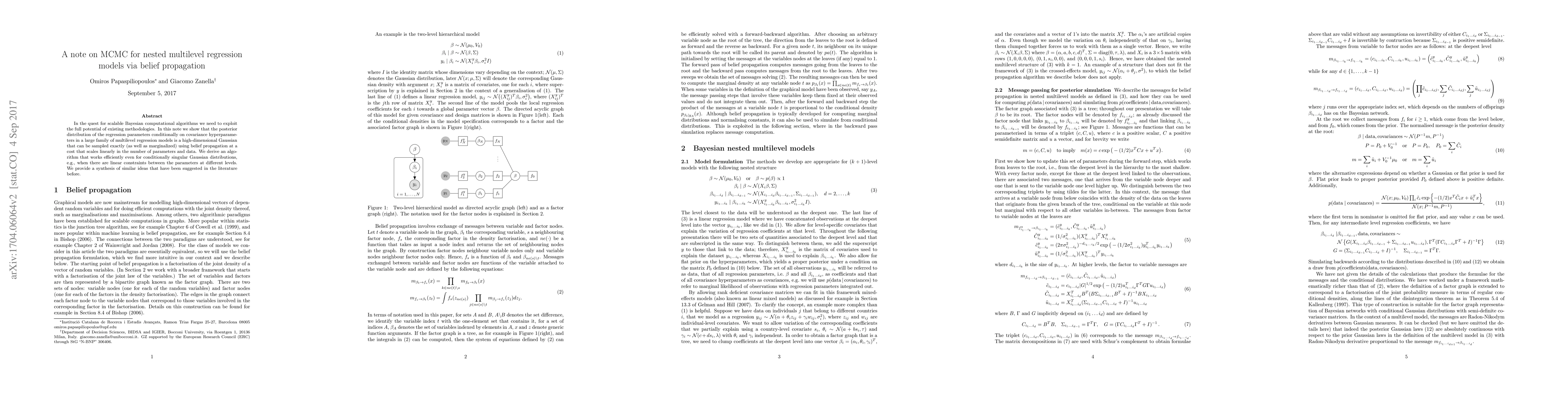 In the quest for scalable Bayesian computational algorithms we need to exploit the full potential of existing methodologies. In this note we point out that message passing algorithms, which are very well developed for inference in graphical models, appear to be largely unexplored for scalable inference in Bayesian multilevel regression models. We show that nested multilevel regression models with Gaussian errors lend themselves very naturally to the combined use of belief propagation and MCMC. Specifically, the posterior distribution of the regression parameters conditionally on covariance hyperparameters is a high-dimensional Gaussian that can be sampled exactly (as well as marginalized) using belief propagation at a cost that scales linearly in the number of parameters and data. We derive an algorithm that works efficiently even for conditionally singular Gaussian distributions, e.g., when there are linear constraints between the parameters at different levels. We show that allowing for such non-invertible Gaussians is critical for belief propagation to be applicable to a large class of nested multilevel models. From a different perspective, the methodology proposed can be seen as a generalization of forward-backward algorithms for sampling to multilevel regressions with tree-structure graphical models, as opposed to single-branch trees used in classical Kalman filter contexts.