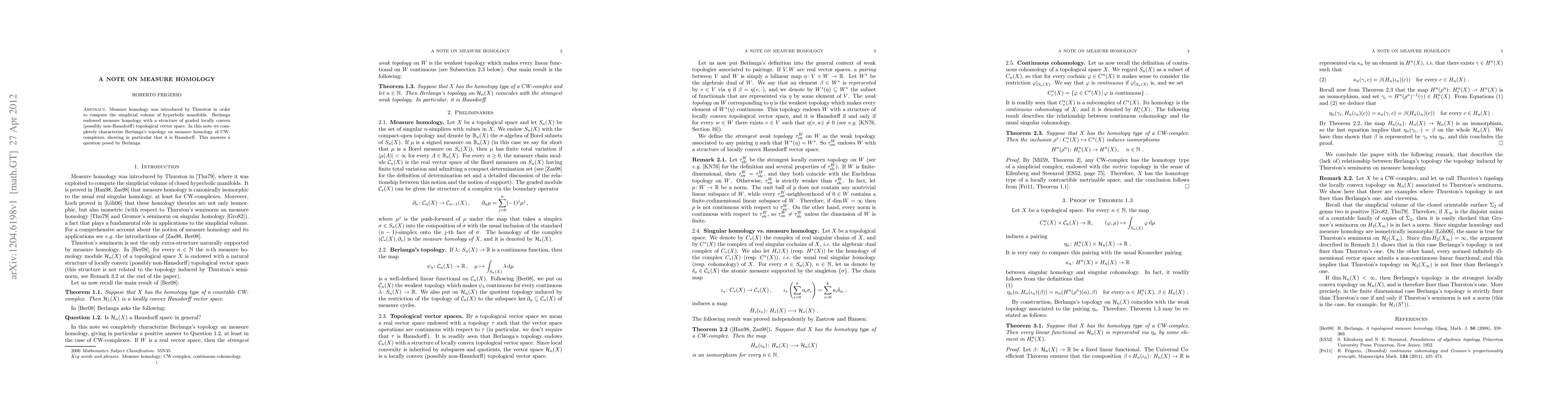 Measure homology was introduced by Thurston in order to compute the simplicial volume of hyperbolic manifolds. Berlanga endowed measure homology with a structure of graded locally convex (possibly non-Hausdorff) topological vector space. In this note we completely characterize Berlanga's topology on measure homology of CW-complexes, showing in particular that it is Hausdorff. This answers a question posed by Berlanga.
