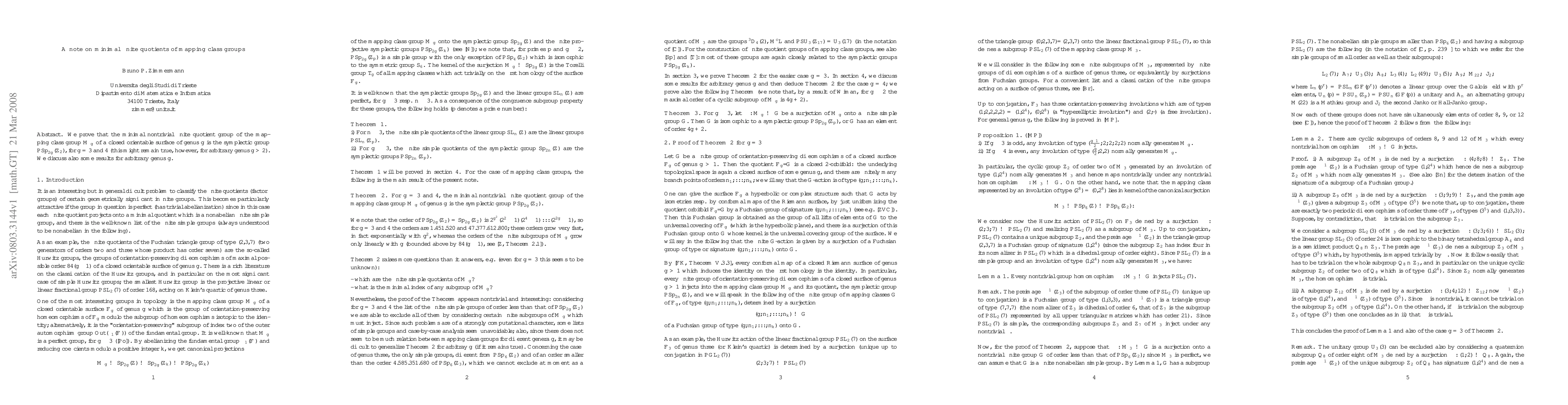 Researchers prove that for surfaces of genus 3 and 4, the minimal nontrivial finite quotient group of the mapping class group is PSp(2g,Z_2), with potential implications for arbitrary genus g.