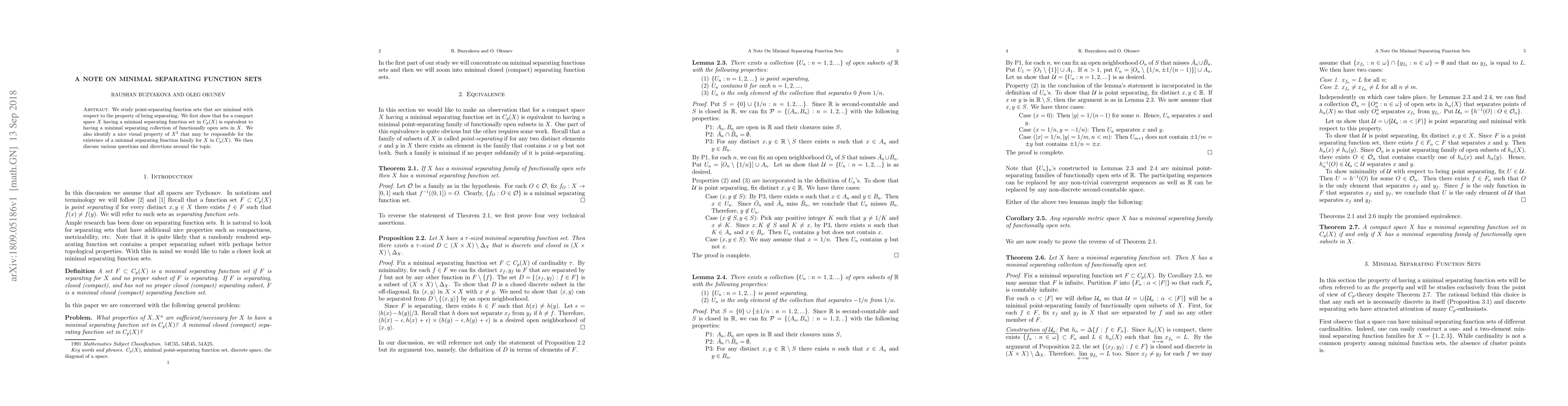 We study point-separating function sets that are minimal with respect to the property of being separating. We first show that for a compact space $X$ having a minimal separating function set in $C_p(X)$ is equivalent to having a minimal separating collection of functionally open sets in $X$. We also identify a nice visual property of $X^2$ that may be responsible for the existence of a minimal separating function family for $X$ in $C_p(X)$. We then discuss various questions and directions around the topic.