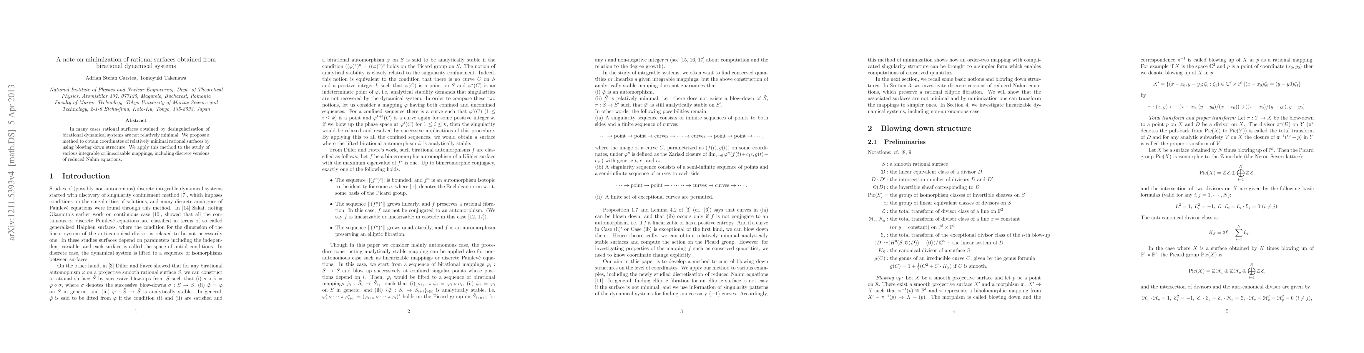 This paper proposes a method to minimize rational surfaces derived from birational dynamical systems by employing blowing down techniques. It applies this approach to study integrable or linearizable mappings, including discrete versions of reduced Nahm equations.