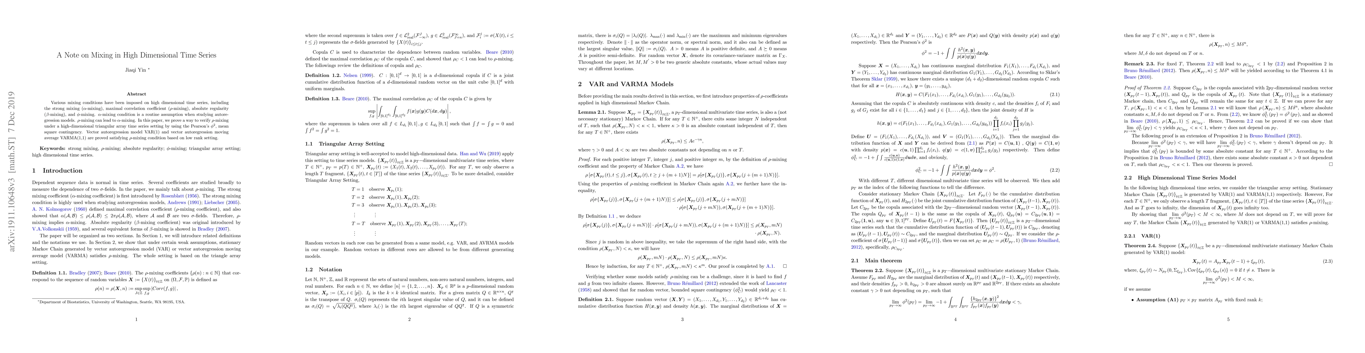 Various mixing conditions have been imposed on high dimensional time series, including the strong mixing ($\alpha$-mixing), maximal correlation coefficient ($\rho$-mixing), absolute regularity ($\beta$-mixing), and $\phi$-mixing. $\alpha$-mixing condition is a routine assumption when studying autoregression models. $\rho$-mixing can lead to $\alpha$-mixing. In this paper, we prove a way to verify $\rho$-mixing under a high-dimensional triangular array time series setting by using the Pearson's $\phi^2$, mean square contingency. Vector autoregression model VAR(1) and vector autoregression moving average VARMA(1,1) are proved satisfying $\rho$-mixing condition based on low rank setting.