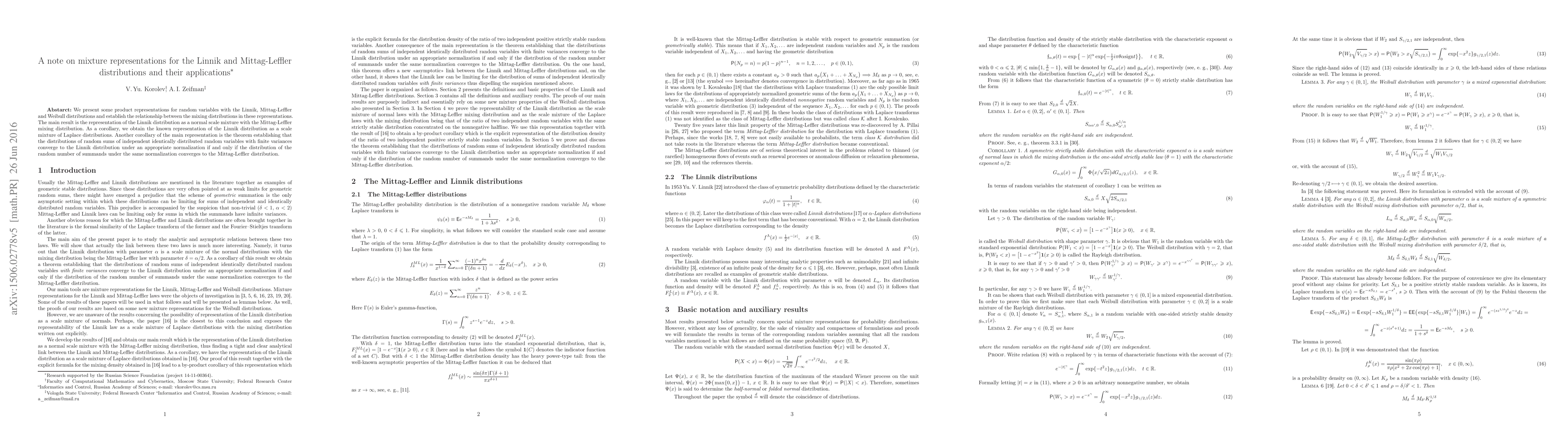 This paper introduces product representations for Linnik, Mittag-Leffler, and Weibull distributions, establishing a normal scale mixture representation for the Linnik distribution with a Mittag-Leffler mixing distribution. It also proves that the convergence of random sums of i.i.d. random variables to the Linnik distribution depends on the convergence of the random number of summands to the Mittag-Leffler distribution.