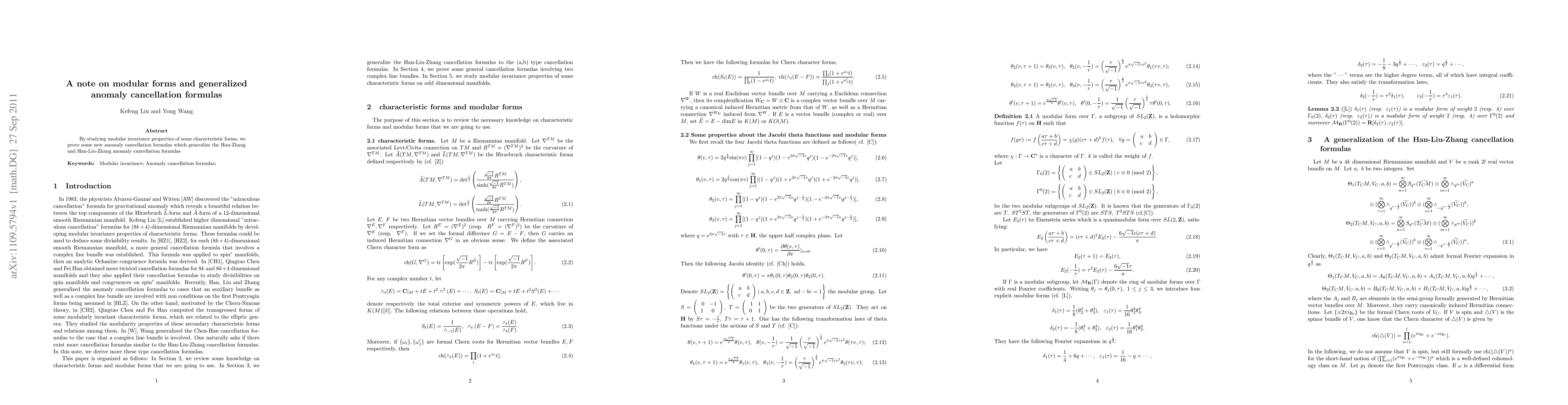 Summary: The paper proves new generalized anomaly cancellation formulas by examining the modular invariance properties of characteristic forms, extending previous results from Han-Zhang and Han-Liu-Zhang.