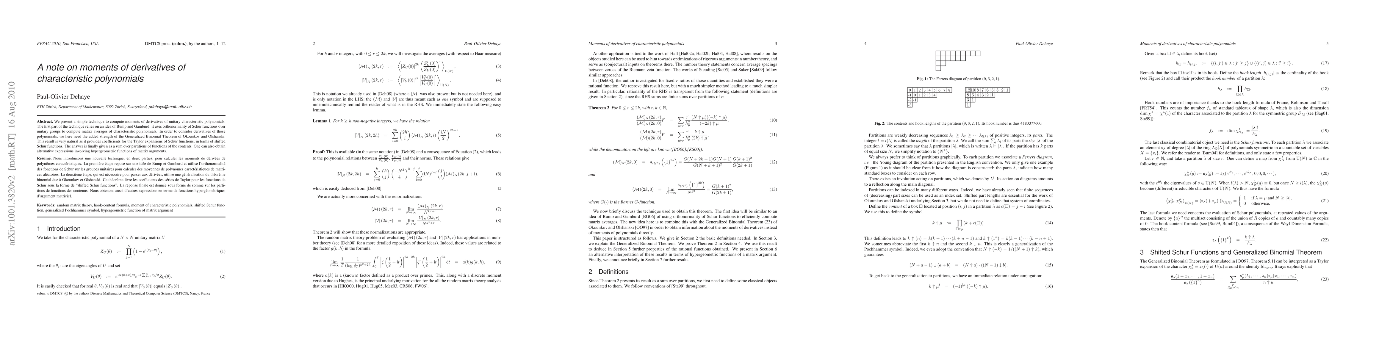 This paper introduces a method to compute moments of derivatives of unitary characteristic polynomials using orthonormality of Schur functions and the Generalized Binomial Theorem, yielding results in terms of sums over partitions and hypergeometric functions.
