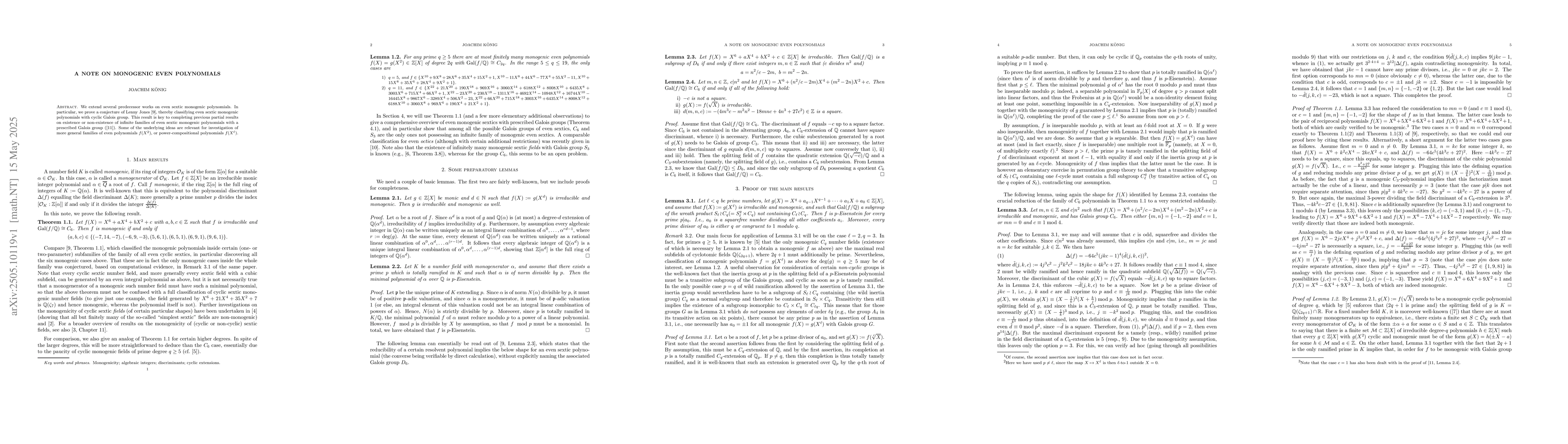 Researchers extend previous work on even sextic monogenic polynomials, proving a conjecture that classifies these polynomials with cyclic Galois group, advancing understanding of their existence and properties.