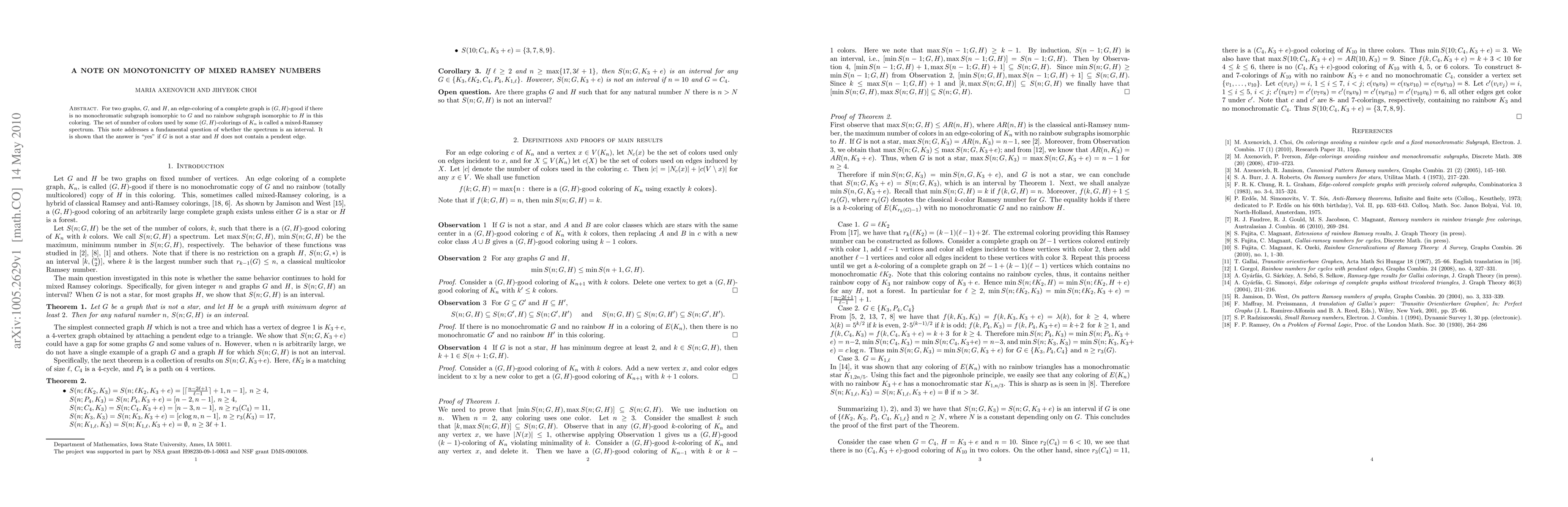 For two graphs, $G$, and $H$, an edge-coloring of a complete graph is $(G,H)$-good if there is no monochromatic subgraph isomorphic to $G$ and no rainbow subgraph isomorphic to $H$ in this coloring. The set of number of colors used by some $(G,H)$-colorings of $K_n$ is called a mixed-Ramsey spectrum. This note addresses a fundamental question of whether the spectrum is an interval. It is shown that the answer is "yes" if $G$ is not a star and $H$ does not contain a pendent edge.
