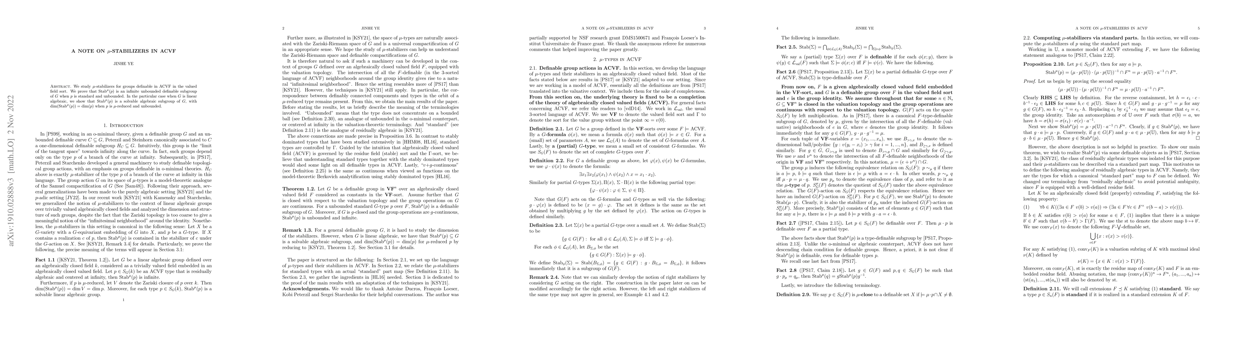 This paper investigates $\mu$-stabilizers for groups definable in ACVF, proving they are infinite unbounded definable subgroups when $p$ is standard and unbounded. For linear algebraic $G$, it shows that $\mathrm{Stab}^\mu(p)$ is a solvable algebraic subgroup with dimension equal to that of $p$ when $p$ is $\mu$-reduced and unbounded.