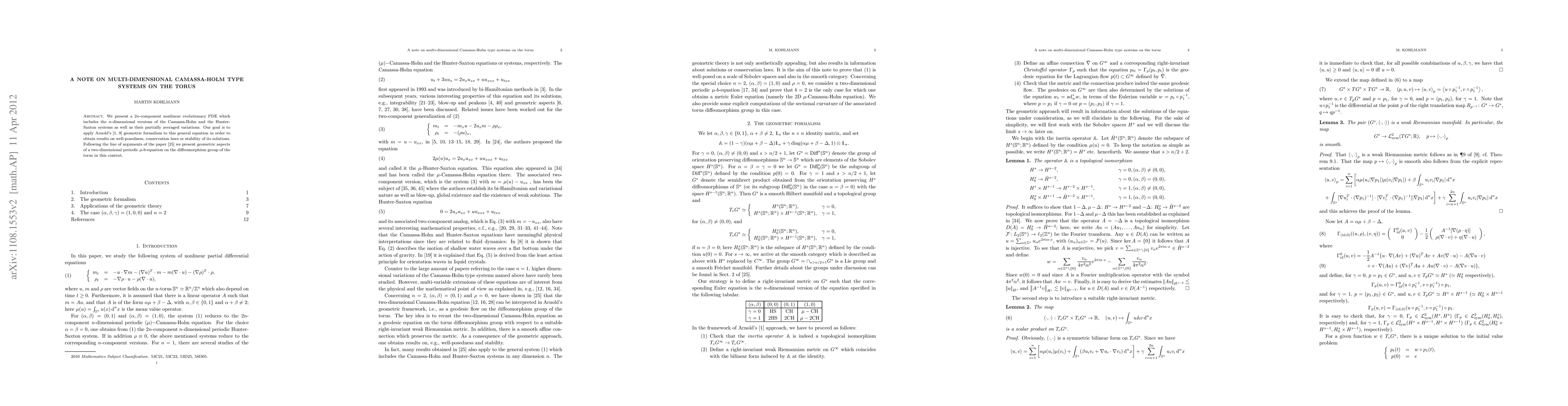 We present a $2n$-component nonlinear evolutionary PDE which includes the $n$-dimensional versions of the Camassa-Holm and the Hunter-Saxton systems as well as their partially averaged variations. Our goal is to apply Arnold's [V.I. Arnold, Sur la g\'eom\'etrie diff\'erentielle des groupes de Lie de dimension infinie et ses applications \`a l'hydrodynamique des fluides parfaits. Ann. Inst. Fourier (Grenoble) 16 (1966) 319-361], [D.G. Ebin and J.E. Marsden, Groups of diffeomorphisms and the motion of an incompressible fluid. Ann. of Math. 92(2) (1970) 102-163] geometric formalism to this general equation in order to obtain results on well-posedness, conservation laws or stability of its solutions. Following the line of arguments of the paper [M. Kohlmann, The two-dimensional periodic $b$-equation on the diffeomorphism group of the torus. J. Phys. A.: Math. Theor. 44 (2011) 465205 (17 pp.)] we present geometric aspects of a two-dimensional periodic $\mu$-$b$-equation on the diffeomorphism group of the torus in this context.