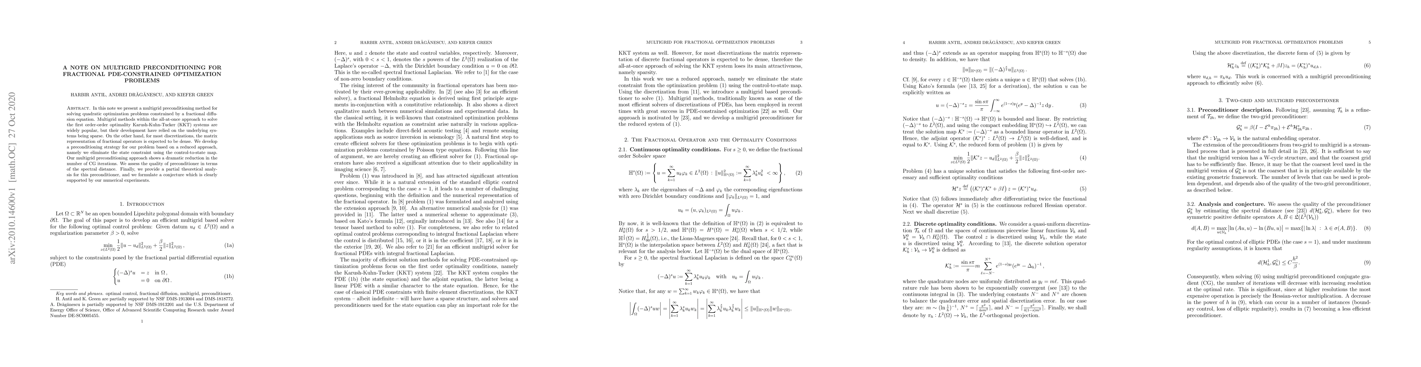 In this note we present a multigrid preconditioning method for solving quadratic optimization problems constrained by a fractional diffusion equation. Multigrid methods within the all-at-once approach to solve the first order-order optimality Karush-Kuhn-Tucker (KKT) systems are widely popular, but their development have relied on the underlying systems being sparse. On the other hand, for most discretizations, the matrix representation of fractional operators is expected to be dense. We develop a preconditioning strategy for our problem based on a reduced approach, namely we eliminate the state constraint using the control-to-state map. Our multigrid preconditioning approach shows a dramatic reduction in the number of CG iterations. We assess the quality of preconditioner in terms of the spectral distance. Finally, we provide a partial theoretical analysis for this preconditioner, and we formulate a conjecture which is clearly supported by our numerical experiments.