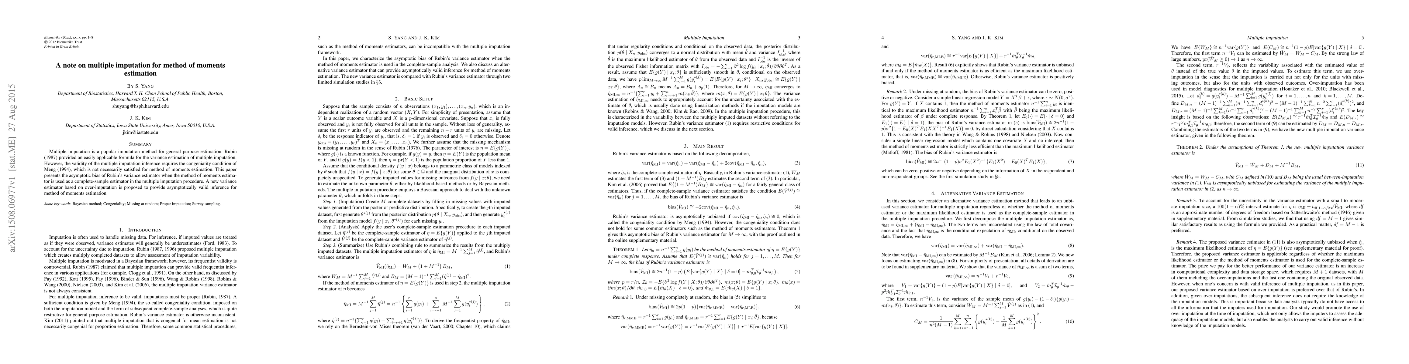 This paper examines the asymptotic bias of Rubin's variance estimator in multiple imputation when used with method of moments estimation, which often violates the congeniality condition. It proposes a new variance estimator based on over-imputation to achieve asymptotically valid inference for method of moments estimation.